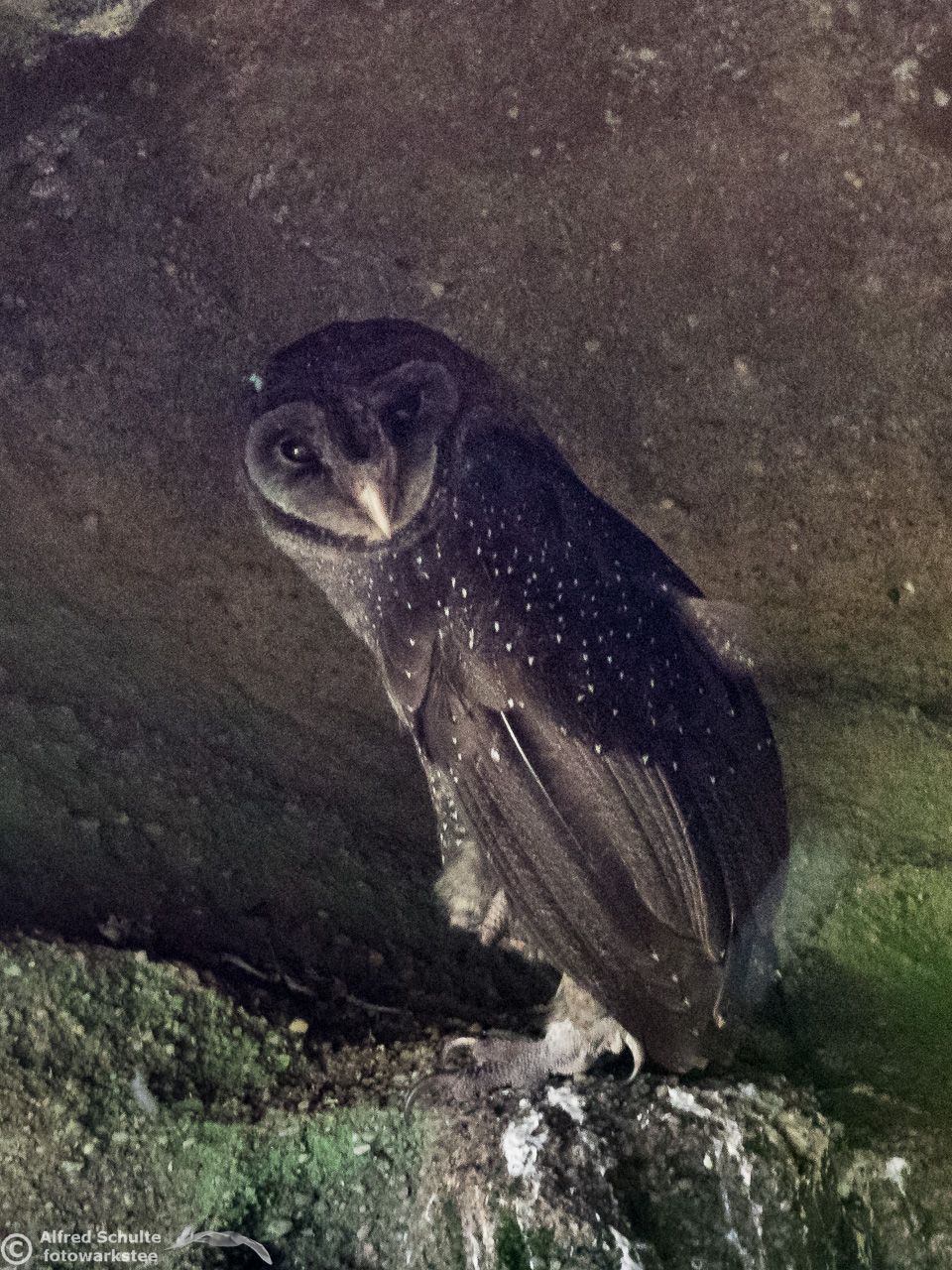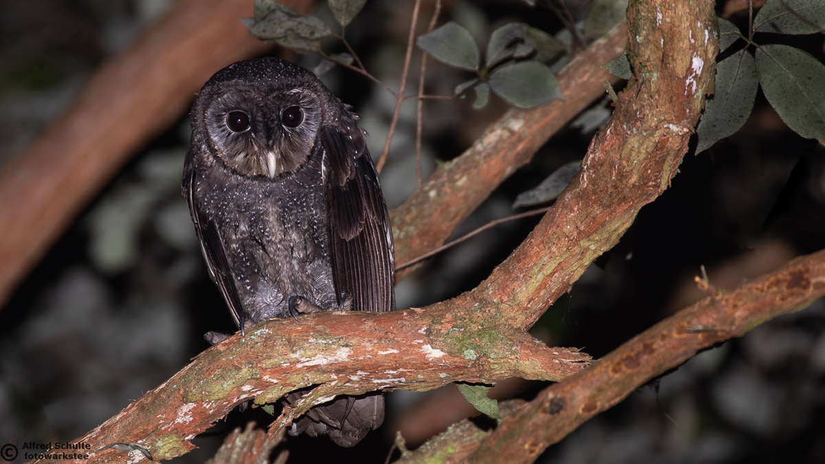 The Greater Sooty Owl (Rußeule for my German friends) is sooty-blackish with fine silvery spots. It has very large black eyes in a round facial disc, which is surrounded by dark edge. The upper-parts of the owl are dark sooty blackish-brown, with fine white spots on the body. The body length varies from 35-45 cm. The female bird is the bigger animal having a wingspan of about 100 cm. Like many other owls, the birds have large feet and strong talons.