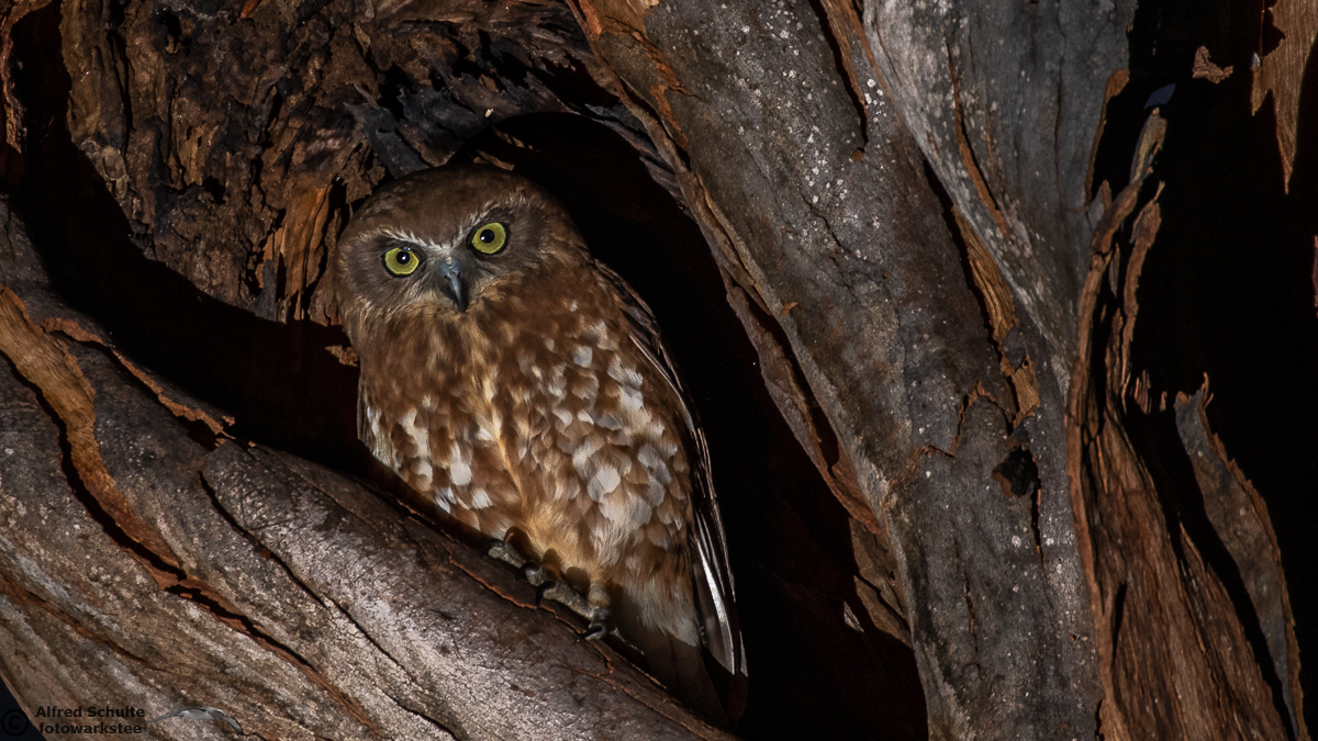 The Southern Boobook (Ninox boobook) is the smallest Australian Owl with 4 sub-species in Australia and originally considered to be the same species as the New Zealand Morepork. In the meantime it has been split and is now treated as full species. The name is reflecting its characteristic "boo-book" call (see example below). The Southern Boobook feeds on insects and small vertebrates, which it catches very often from being perched on fence posts or trees. It usually starts breeding in late winter, using tree hollows for nesting .