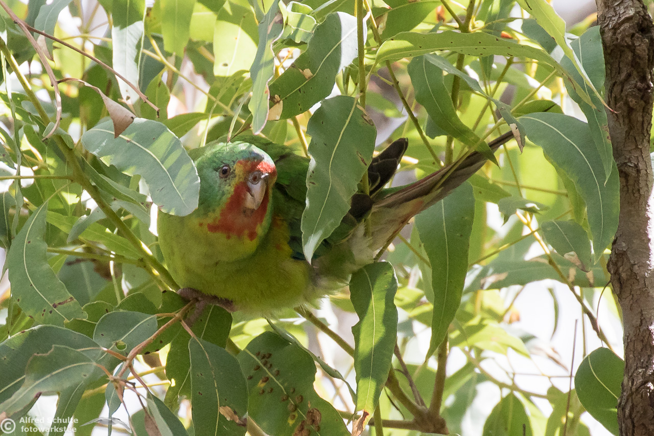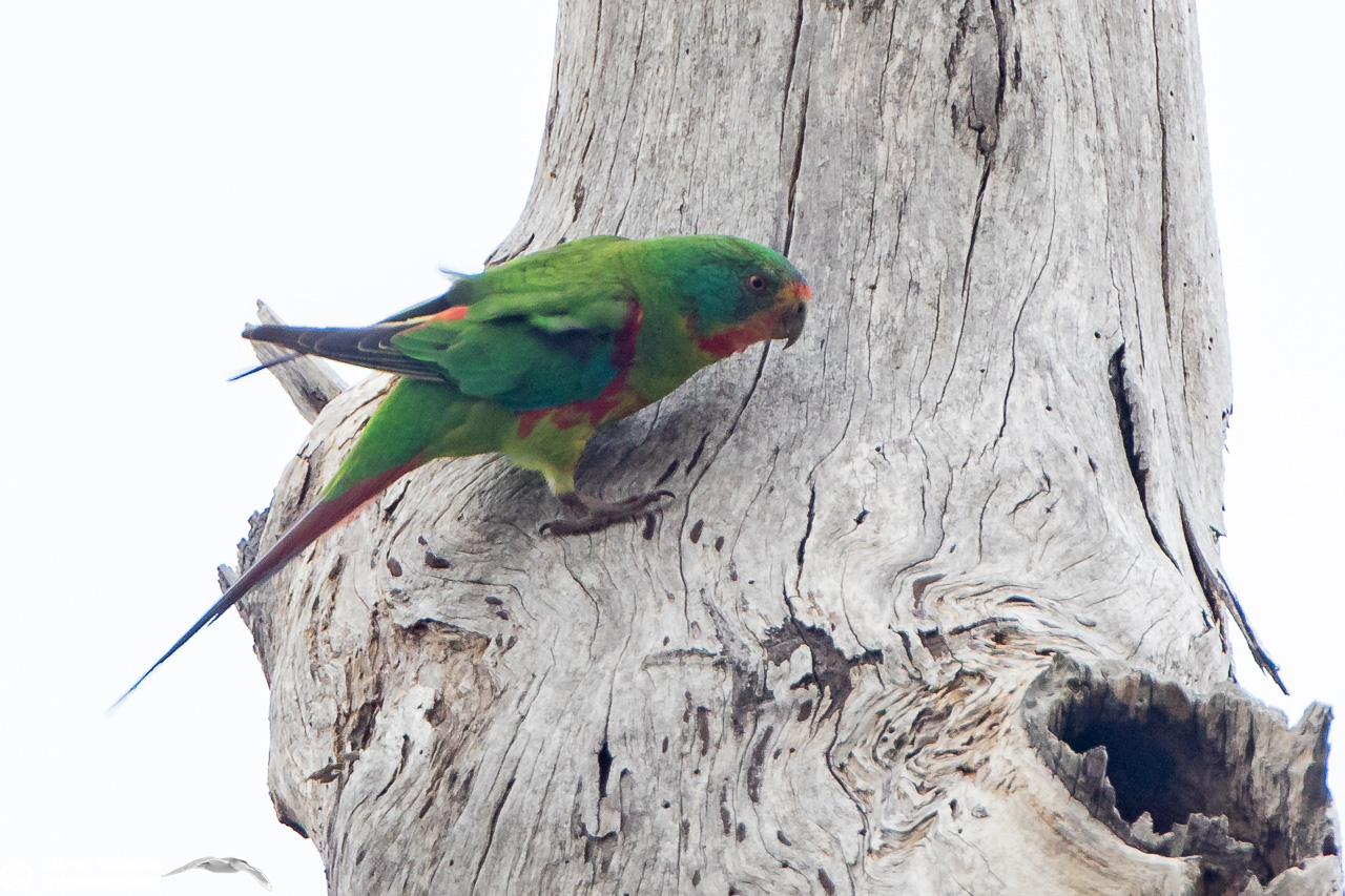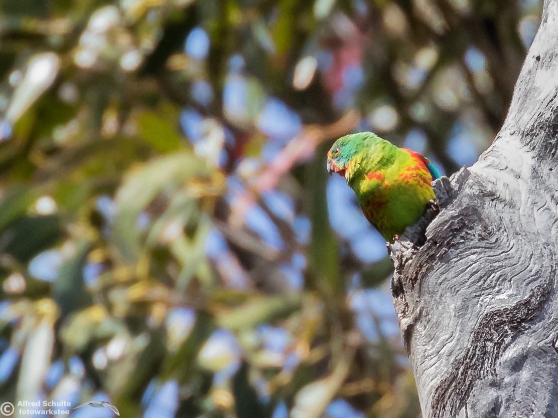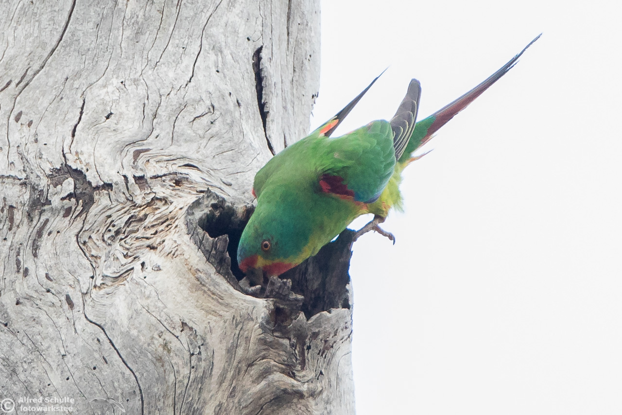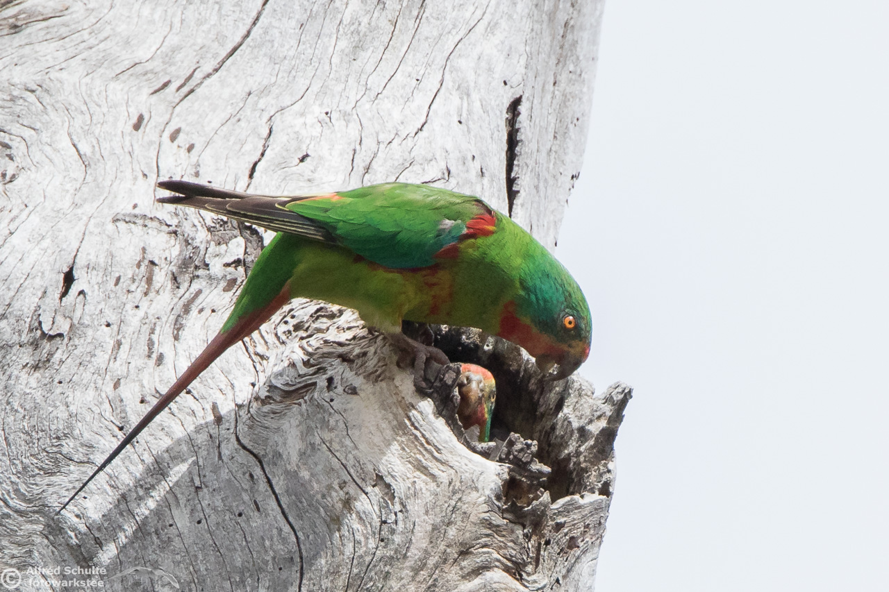 Our daughter Christine and I went to Bruny Island in November 2016 to see and photograph these birds. The Swift Parrots do not breed every year in the same spots in Tasmania, their breeding ground are determined by their main food source: flowering Blue Gums. And in 2016 there was a massive flowering happening on Bruny Island, and so the vast majority of the Swift Parrot population was on Bruny. We were lucky to arrive there, before the birds fledged and left the nest.