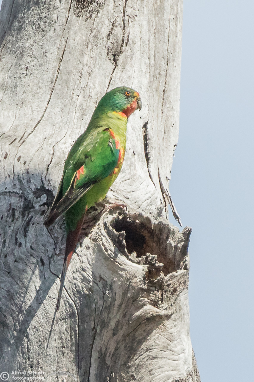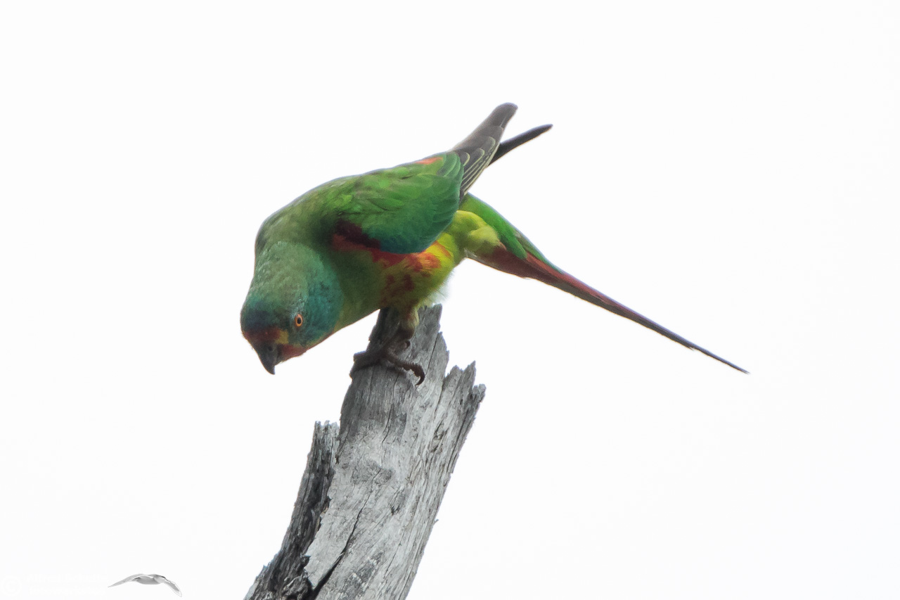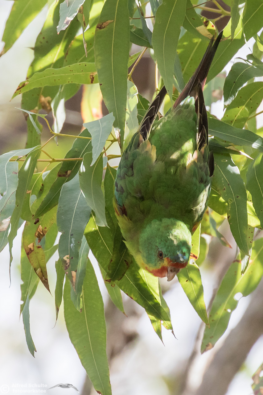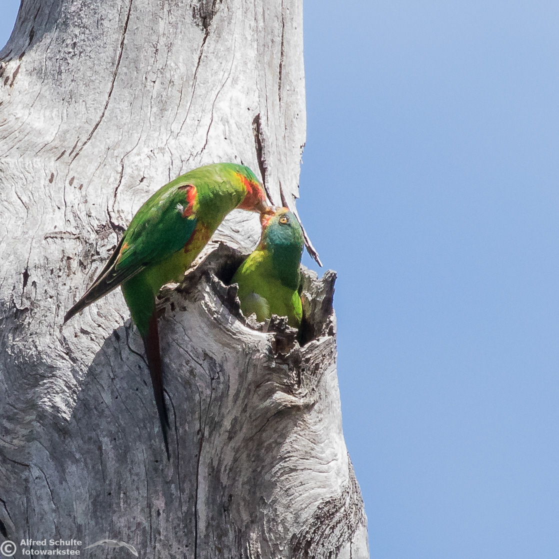 Our daughter Christine and I went to Bruny Island in November 2016 to see and photograph these birds. The Swift Parrots do not breed every year in the same spots in Tasmania, their breeding ground are determined by their main food source: flowering Blue Gums. And in 2016 there was a massive flowering happening on Bruny Island, and so the vast majority of the Swift Parrot population was on Bruny. We were lucky to arrive there, before the birds fledged and left the nest.