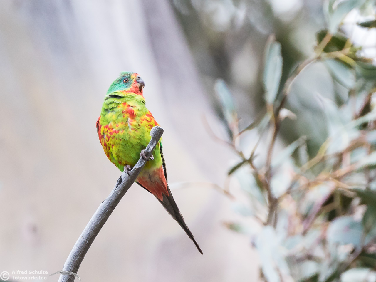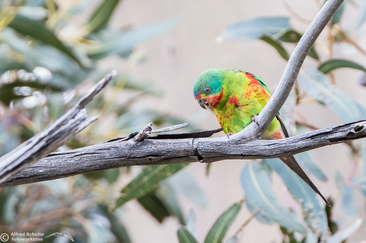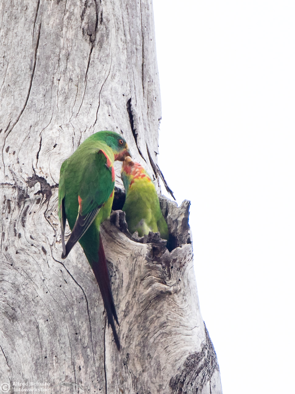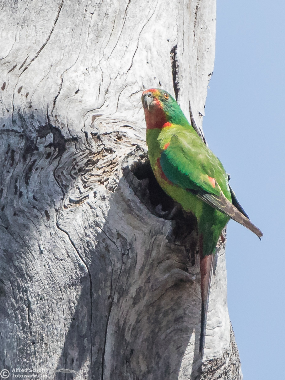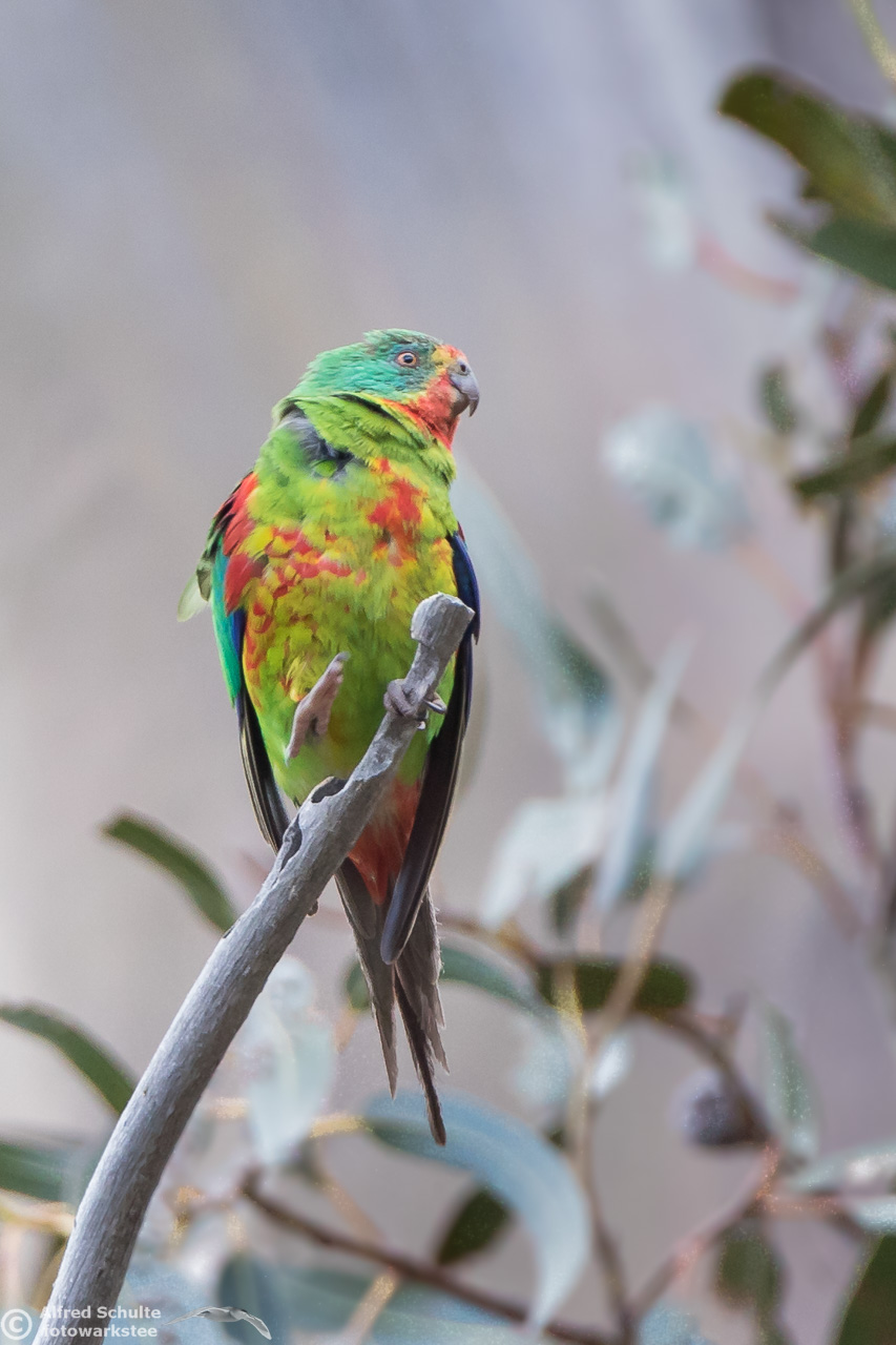 Our daughter Christine and I went to Bruny Island in November 2016 to see and photograph these birds. The Swift Parrots do not breed every year in the same spots in Tasmania, their breeding ground are determined by their main food source: flowering Blue Gums. And in 2016 there was a massive flowering happening on Bruny Island, and so the vast majority of the Swift Parrot population was on Bruny. We were lucky to arrive there, before the birds fledged and left the nest.