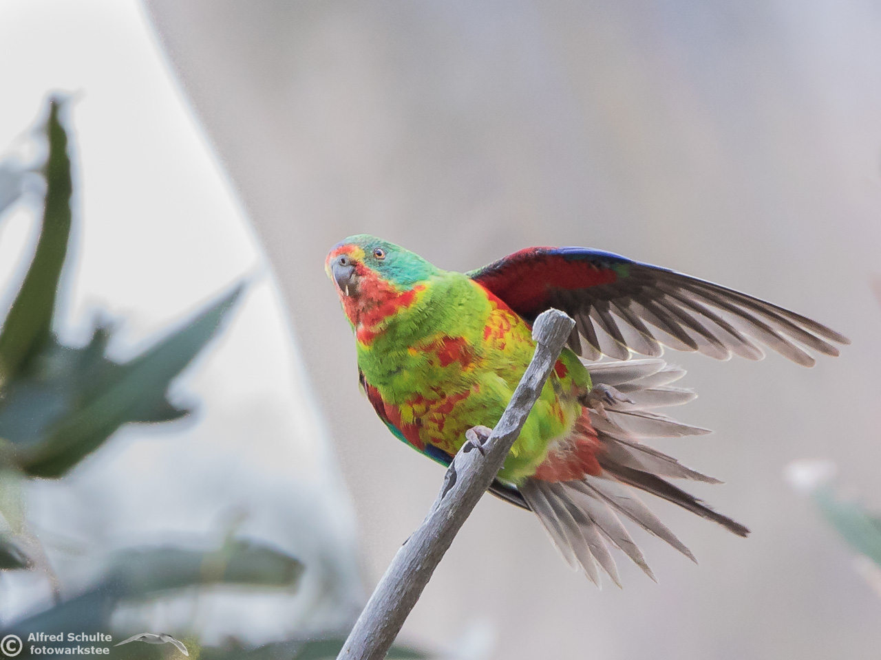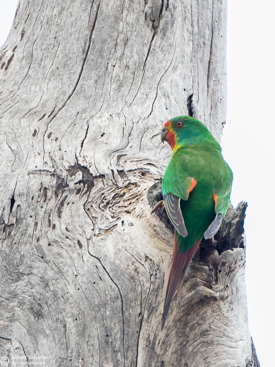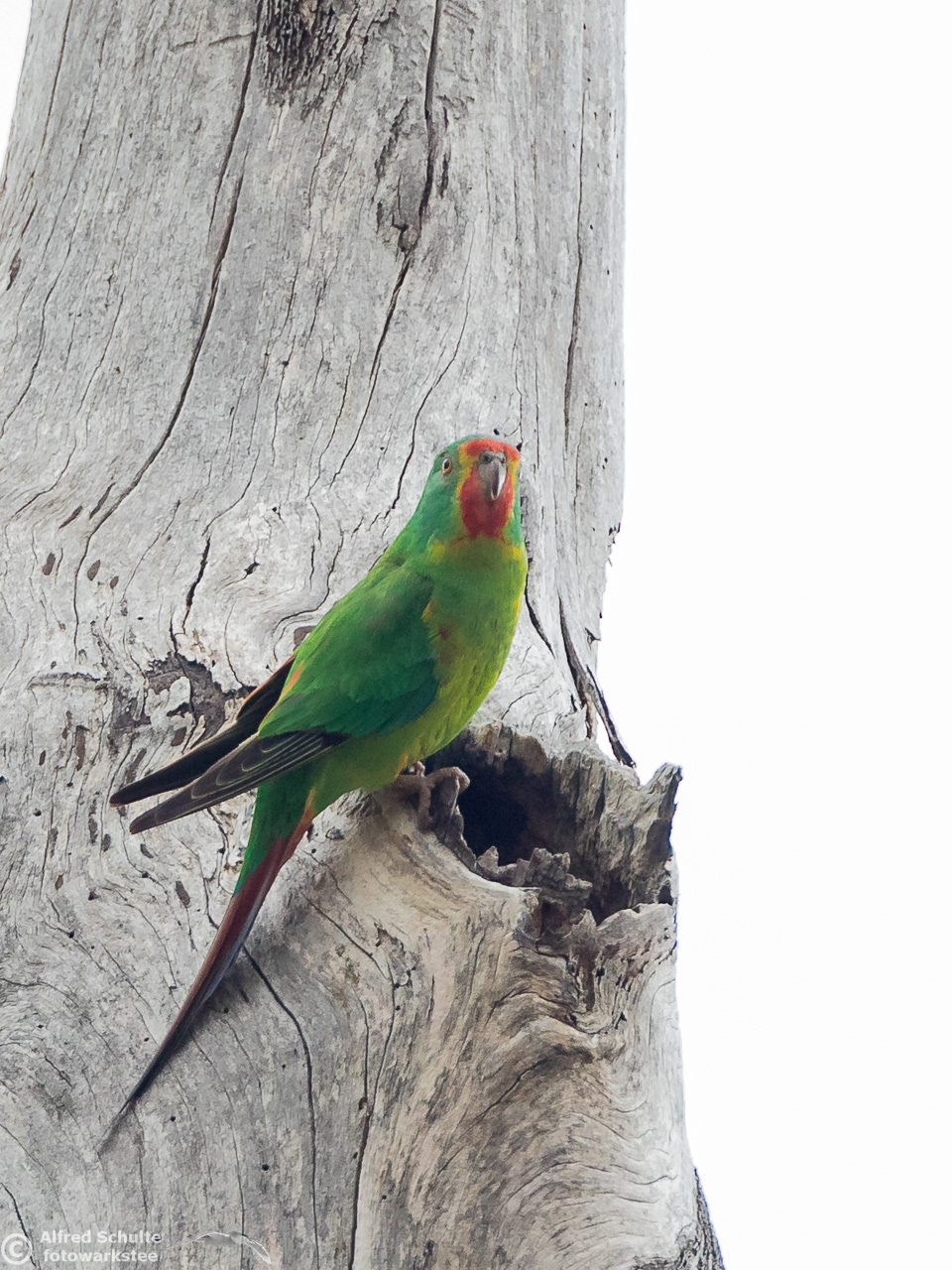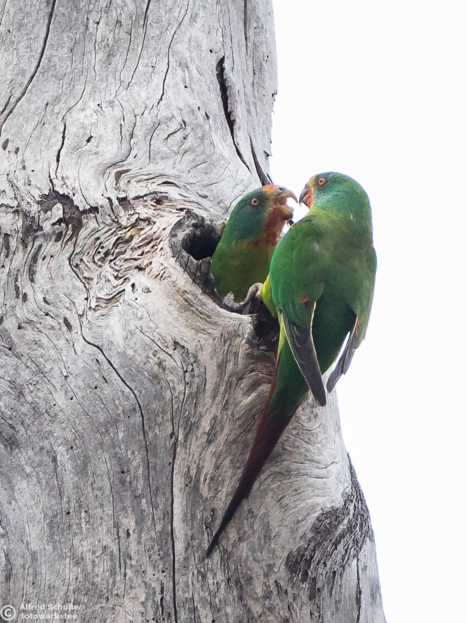 Our daughter Christine and I went to Bruny Island in November 2016 to see and photograph these birds. The Swift Parrots do not breed every year in the same spots in Tasmania, their breeding ground are determined by their main food source: flowering Blue Gums. And in 2016 there was a massive flowering happening on Bruny Island, and so the vast majority of the Swift Parrot population was on Bruny. We were lucky to arrive there, before the birds fledged and left the nest.