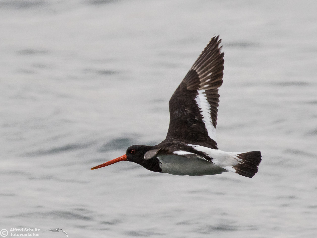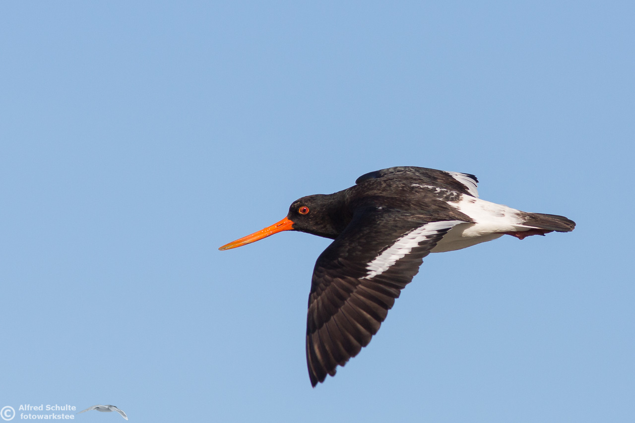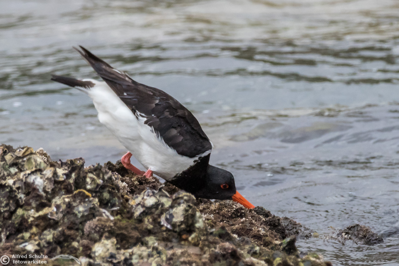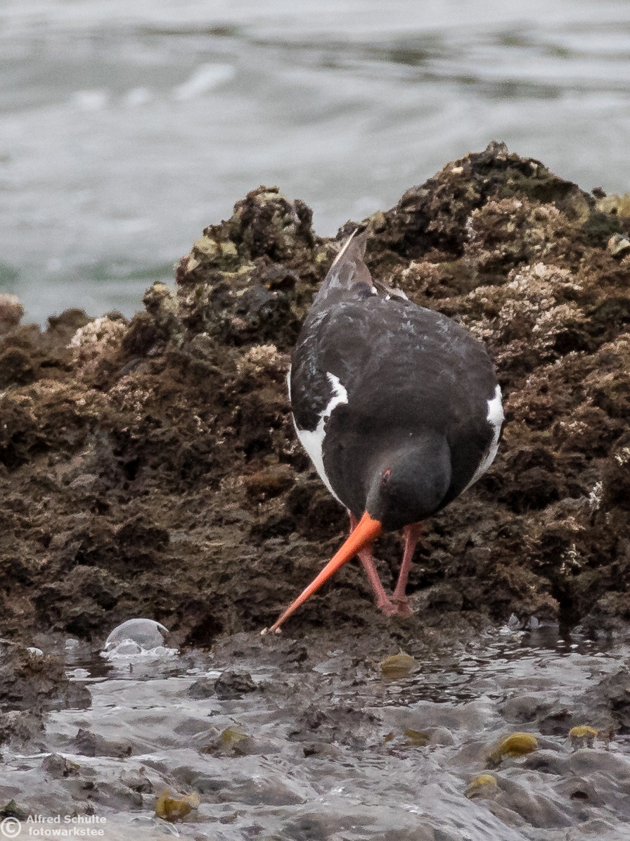 All I needed to do was taking photos and wait until the tide was coming so high that the rock went under water. That was the sign for the bird to relocate and it moved to its usual spot - allowing me some flight shots which clearly show all the characteristics, which separate a SIPO from our normal Pied Oystercatcher.