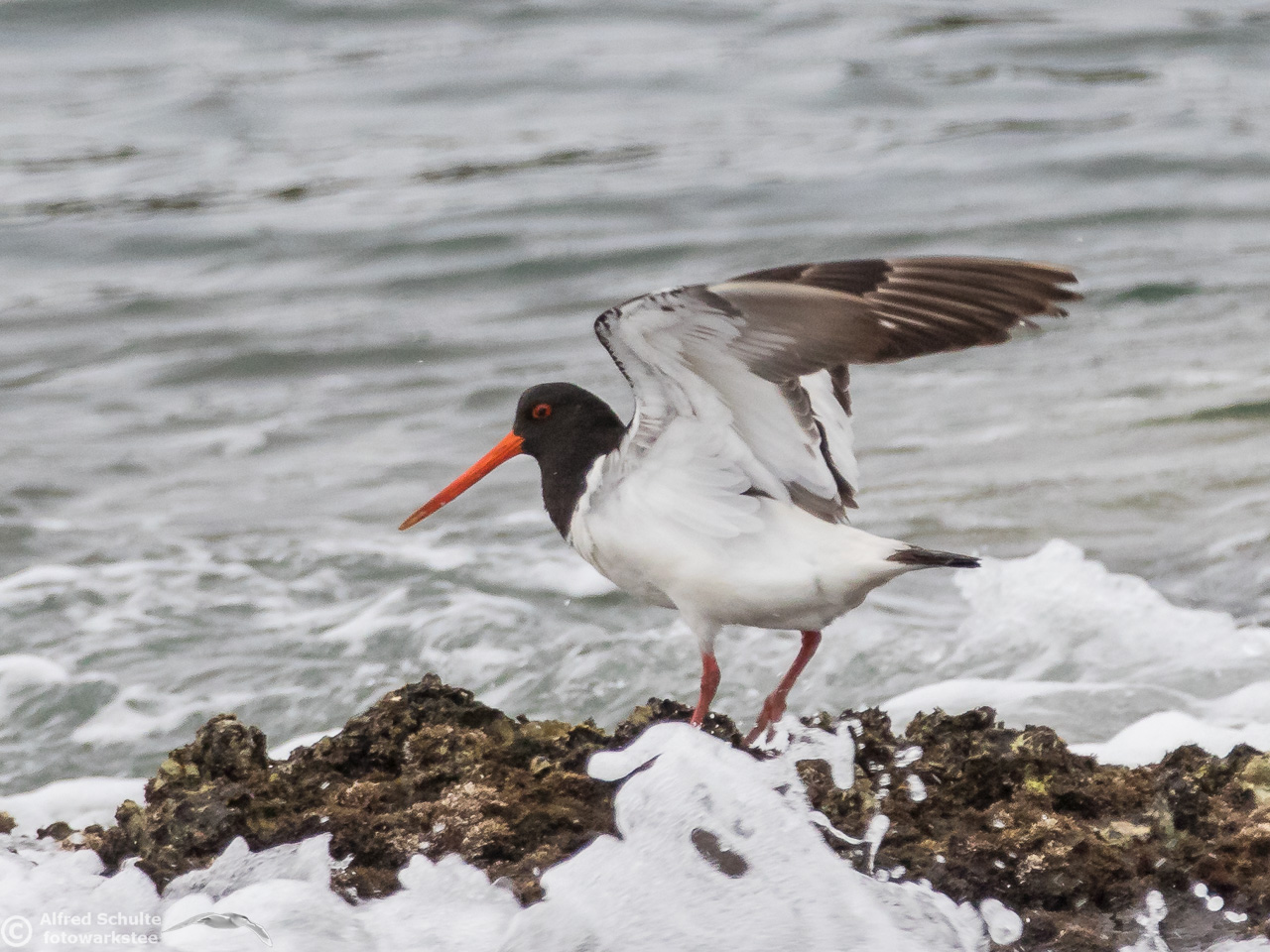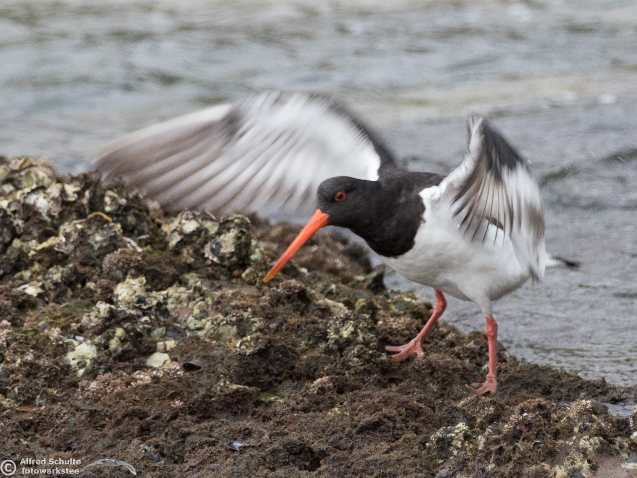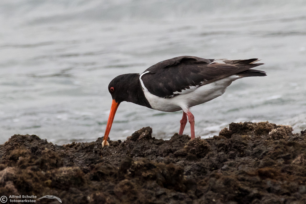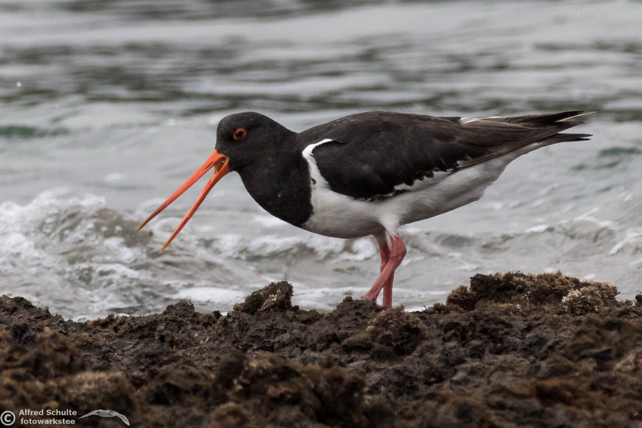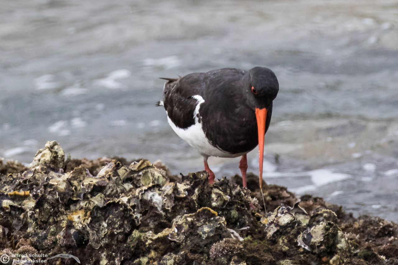 All I needed to do was taking photos and wait until the tide was coming so high that the rock went under water. That was the sign for the bird to relocate and it moved to its usual spot - allowing me some flight shots which clearly show all the characteristics, which separate a SIPO from our normal Pied Oystercatcher.