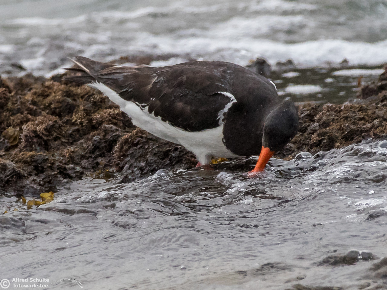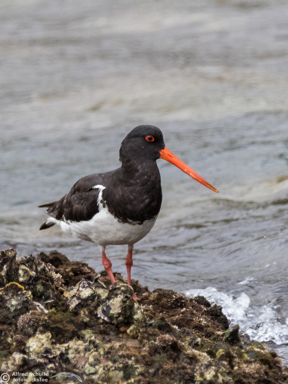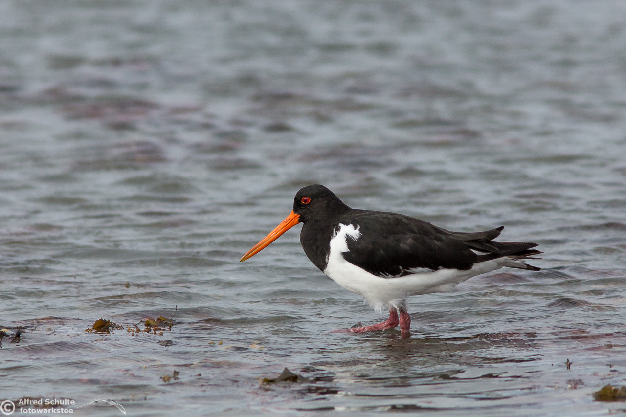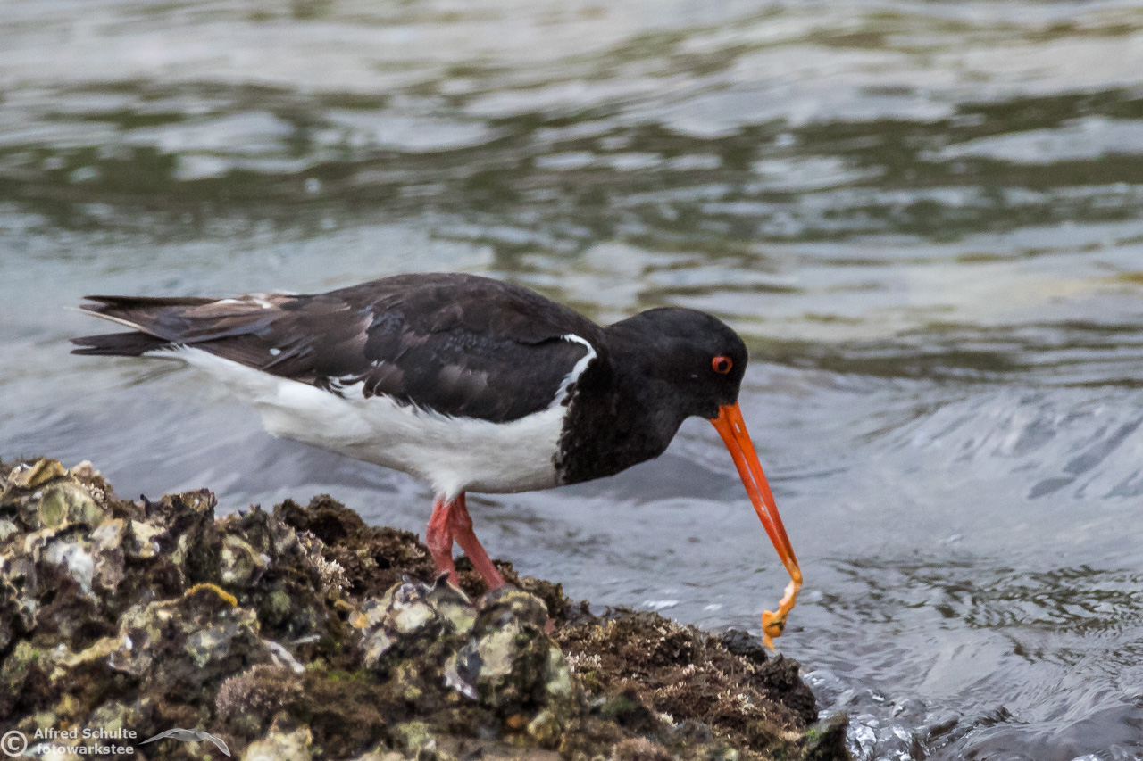 All I needed to do was taking photos and wait until the tide was coming so high that the rock went under water. That was the sign for the bird to relocate and it moved to its usual spot - allowing me some flight shots which clearly show all the characteristics, which separate a SIPO from our normal Pied Oystercatcher.