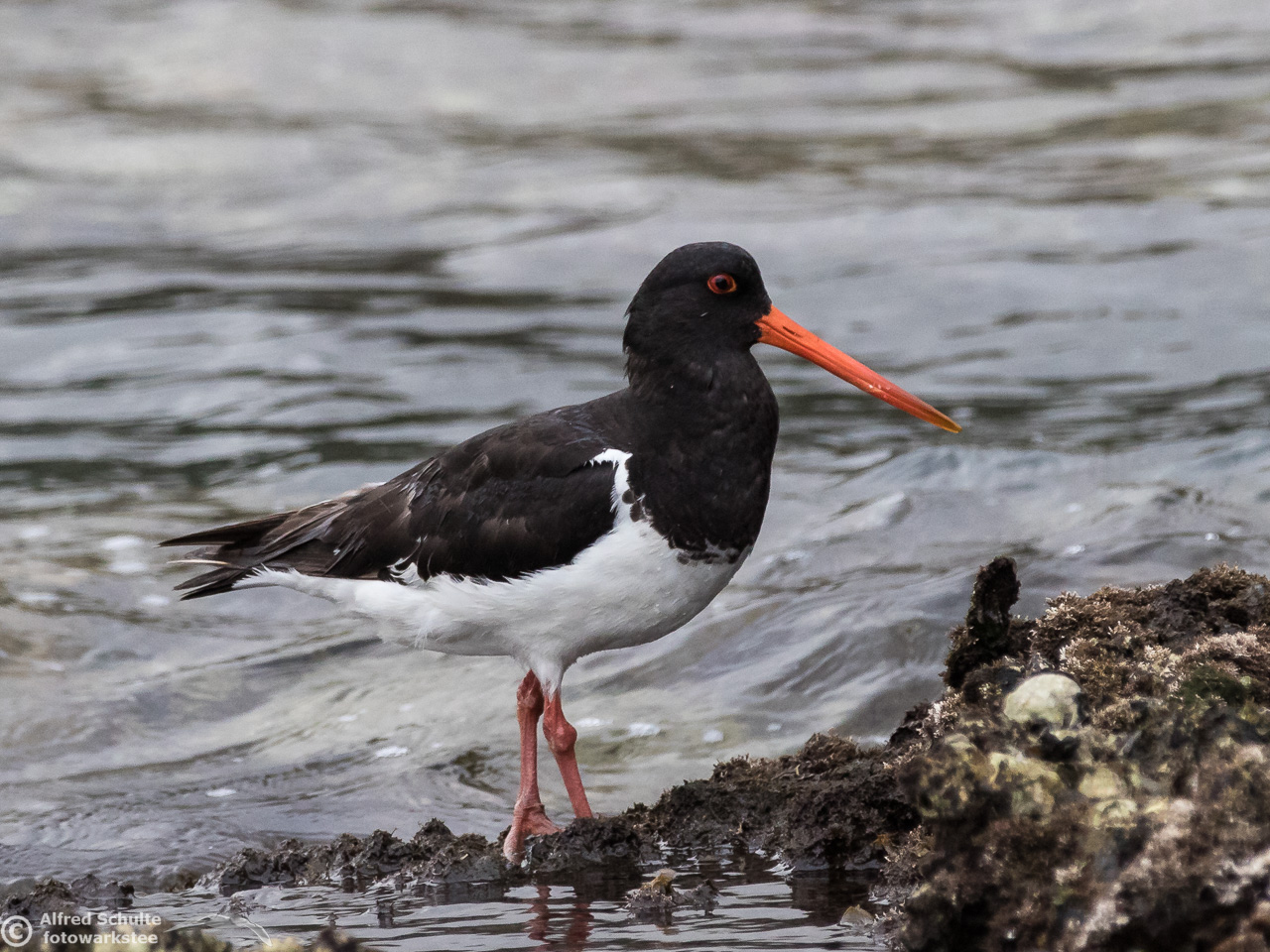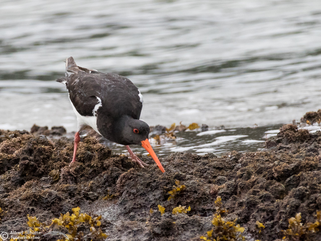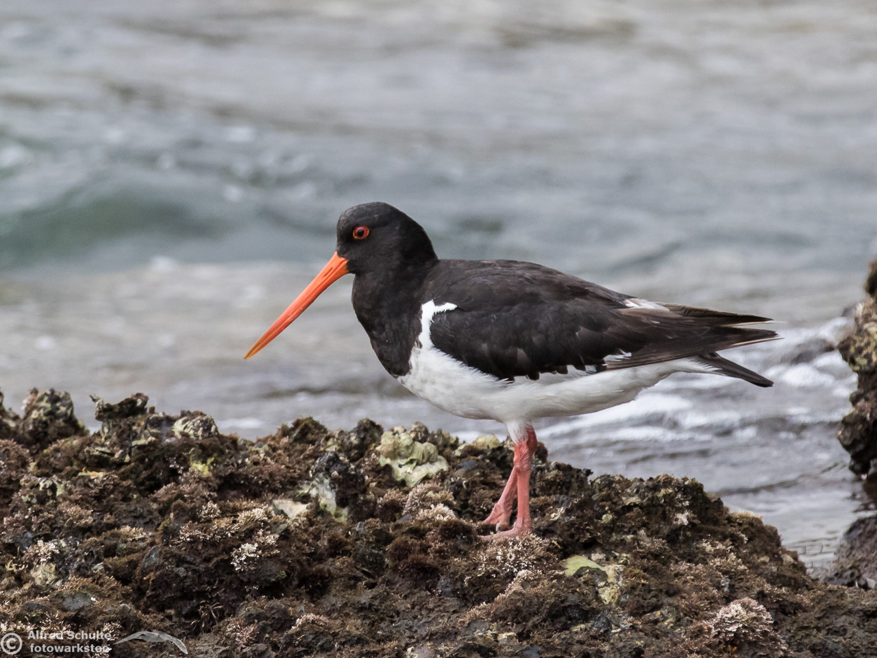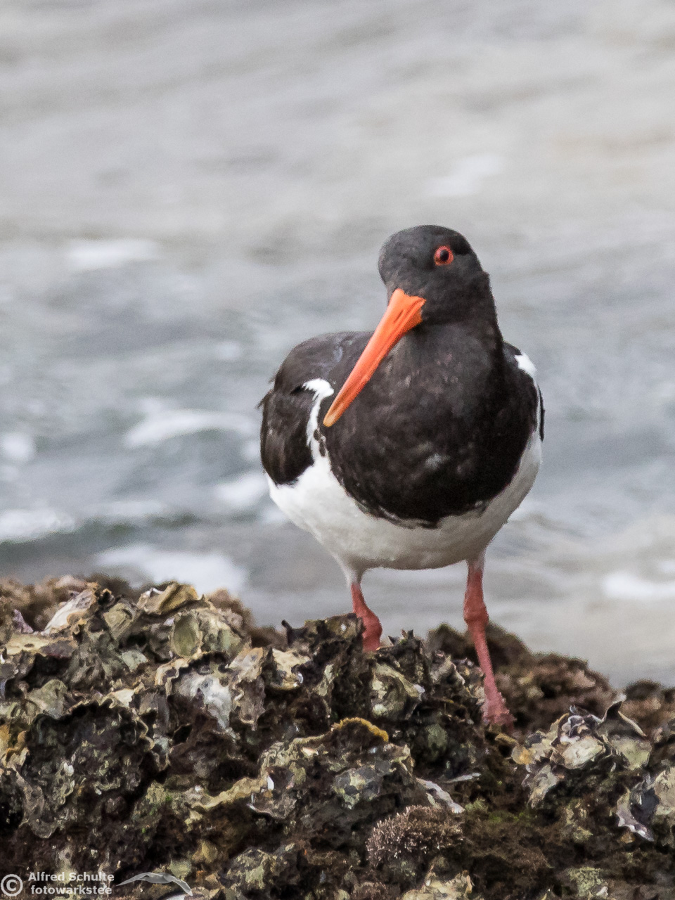 All I needed to do was taking photos and wait until the tide was coming so high that the rock went under water. That was the sign for the bird to relocate and it moved to its usual spot - allowing me some flight shots which clearly show all the characteristics, which separate a SIPO from our normal Pied Oystercatcher.