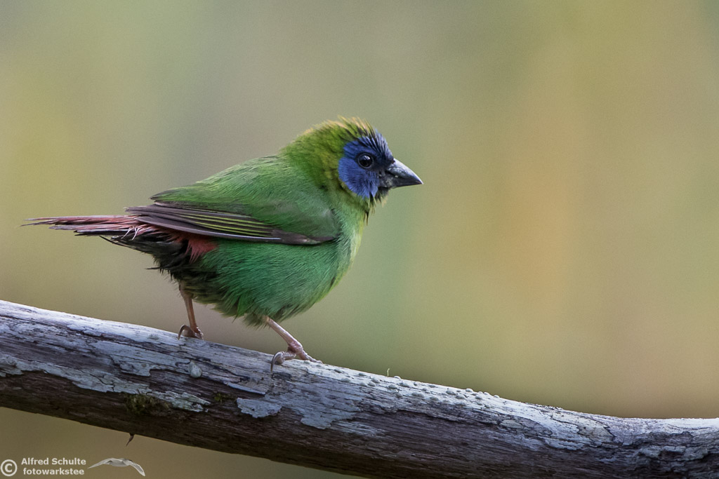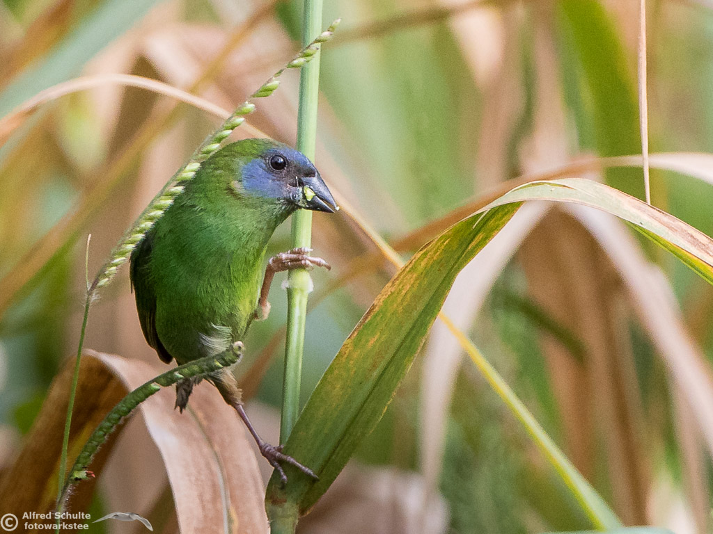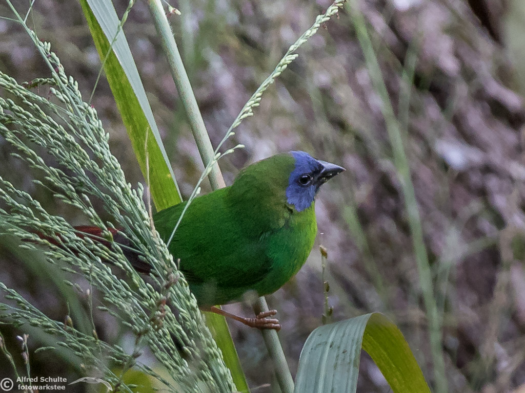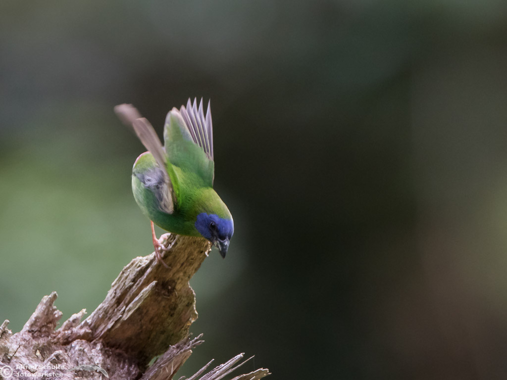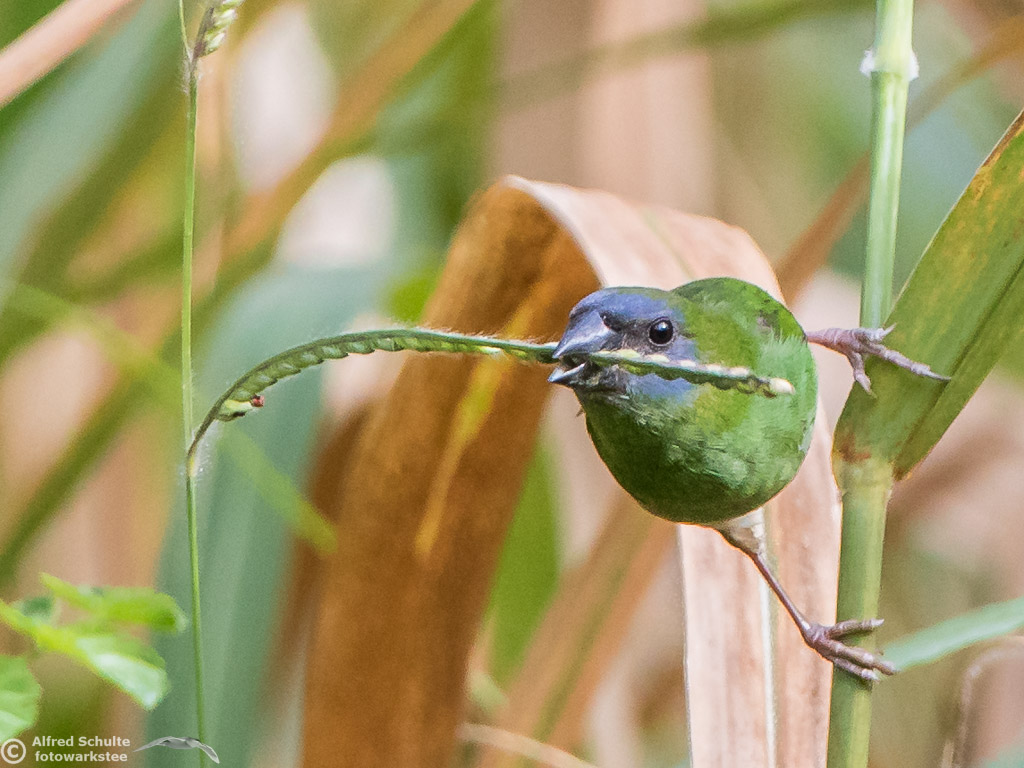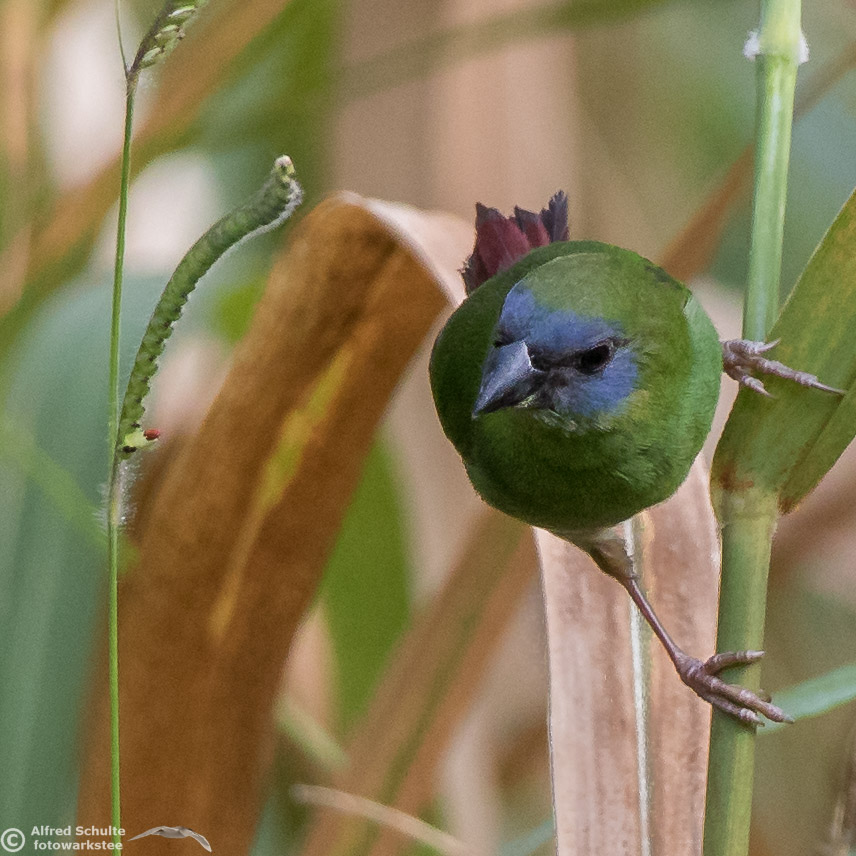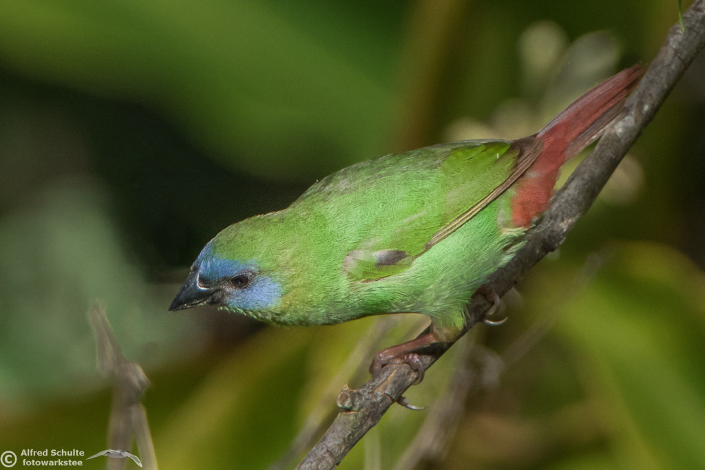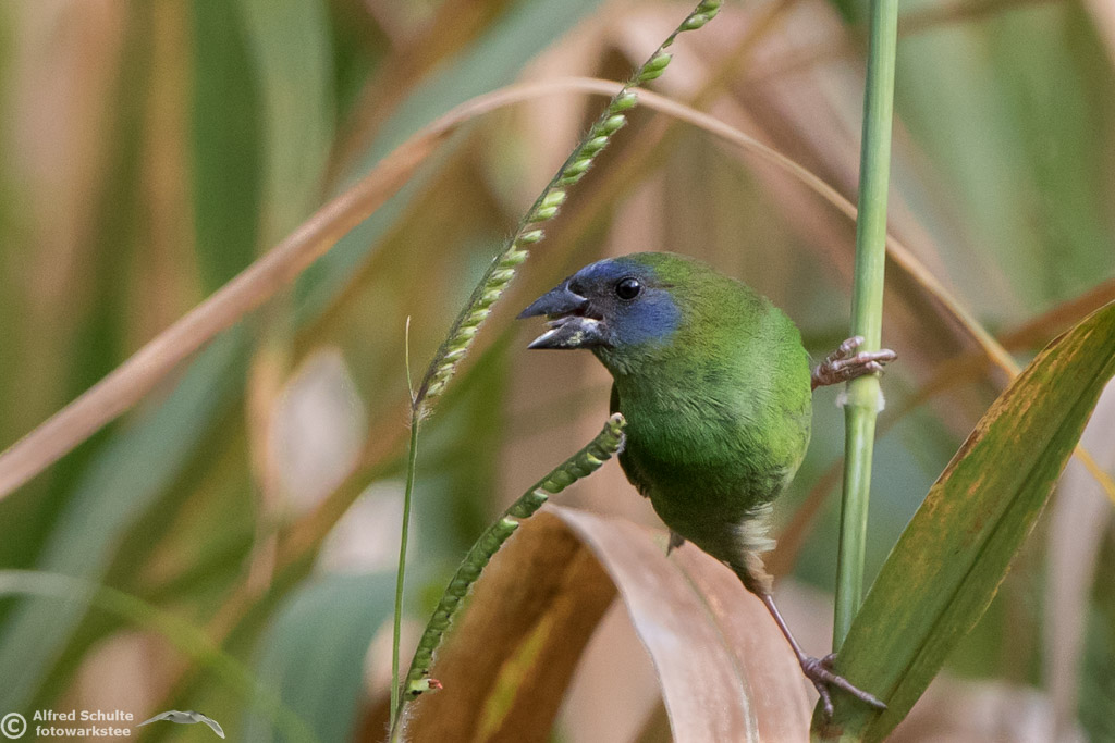 The Blue-faced Parrot-Finches are occurring in high altitude, coastal North Queensland. We have seen the bird at Mt. Lewis. They are restricted to a rather limited area and can be difficult to locate sometimes. Over Easter 2015 we were lucky to find them at better weather then I had seen and photographed them before. This bird is a little bigger than 10 cm in length and beautifully colored with a bright green body and intensive blue facial mask and has a red rump. They feed on grass seeds along the edges of the rain forest. When we were at Mt. Lewis, we have not seen them in great numbers, only 3-6 birds at one time.