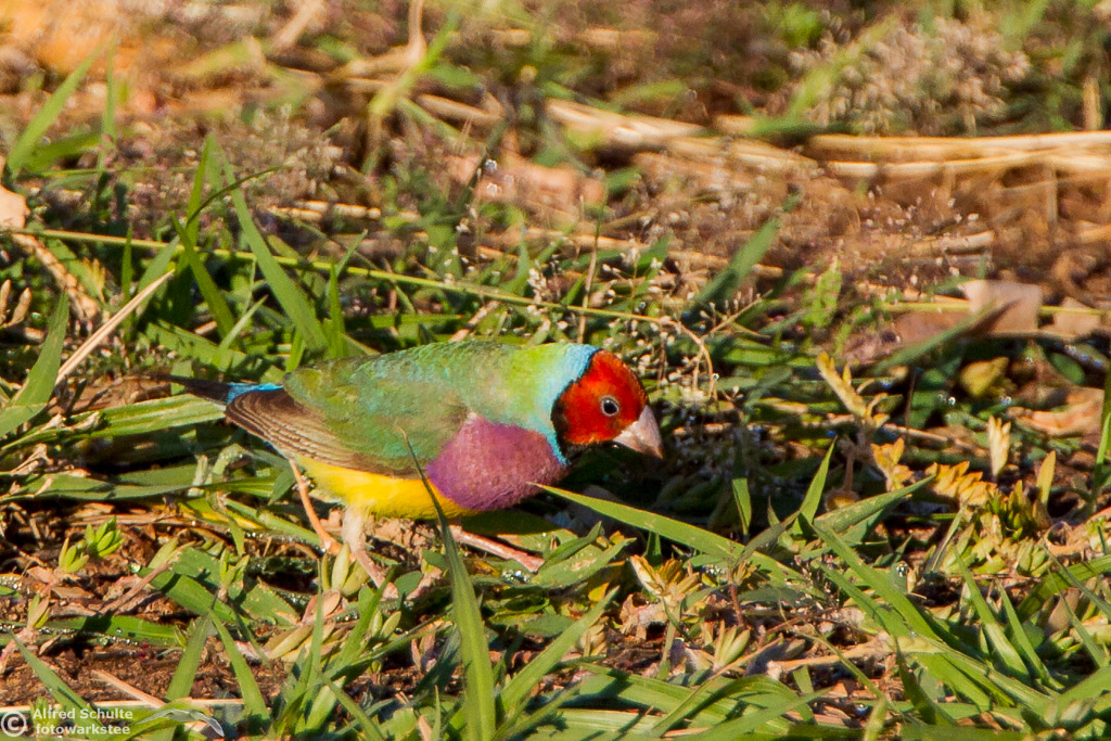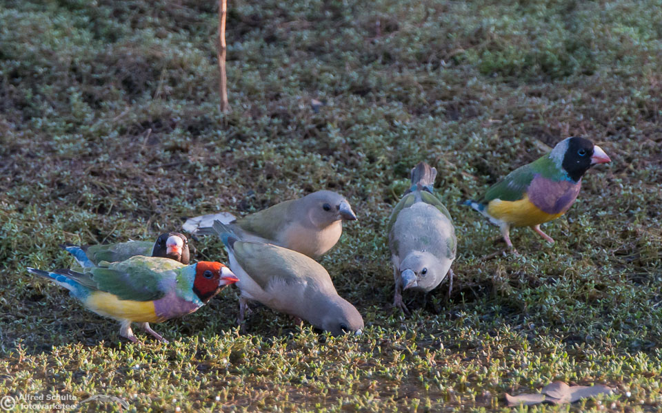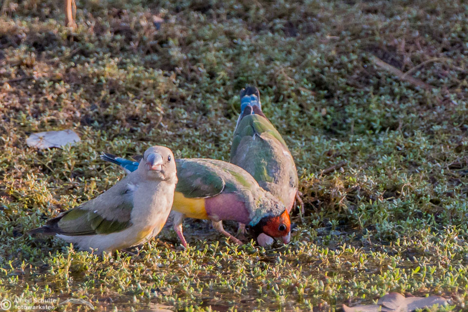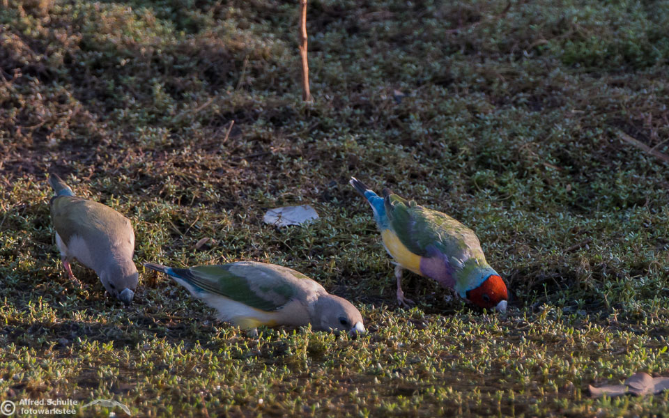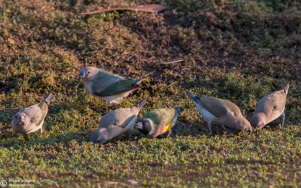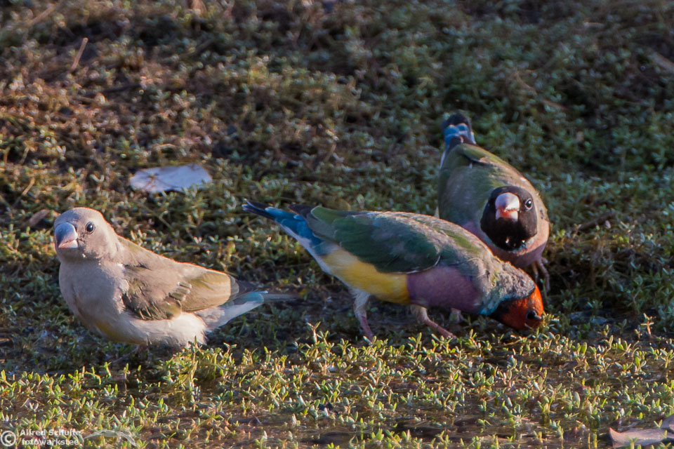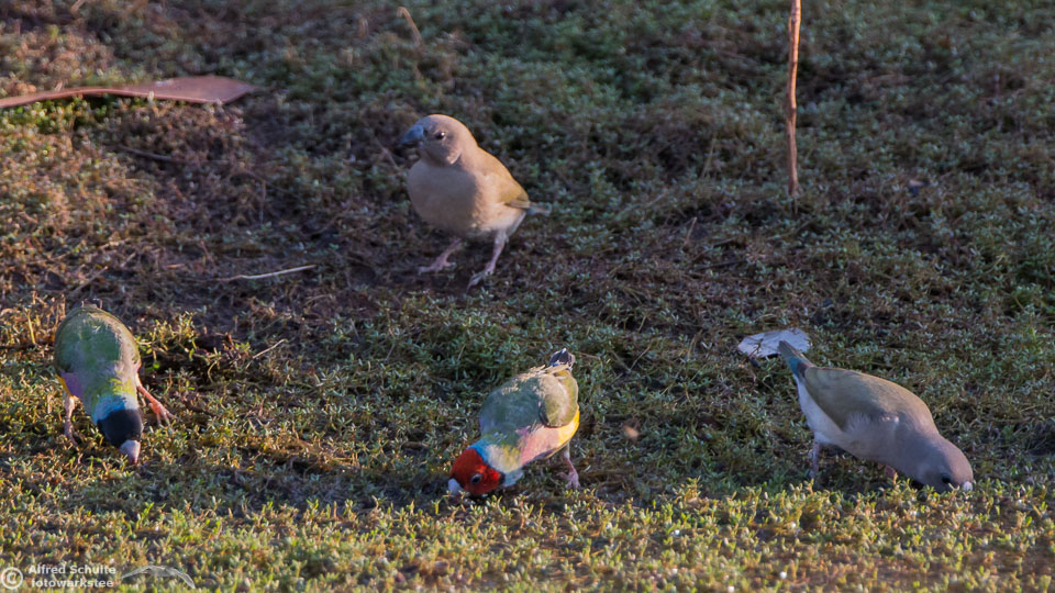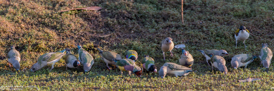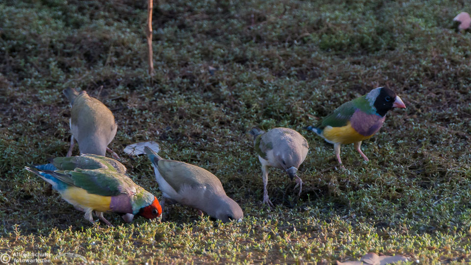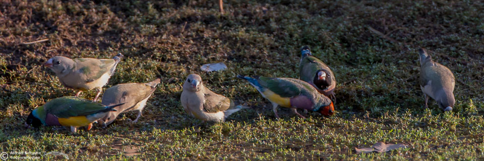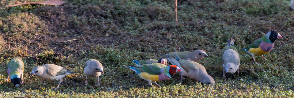 One of my targets during our latest trip to the Northern Territories was to see the colourful Gouldian Finches coming in to a waterhole for their morning drink. Late in the dry season is the best time for this because a lot of waterholes have dried up and it is therefore much easier to find the remaining ones and hope that the Gouldians have had the same idea. Darryl "Biggles" Binns who was with us on this trip organised by the Inala team had located a few possible places, but we needed to search regardless, because some of the waterholes were dry when we finally arrived. But on the last morning in the area around Pine Creek we were in the right spot at the right time and so a dream became true.