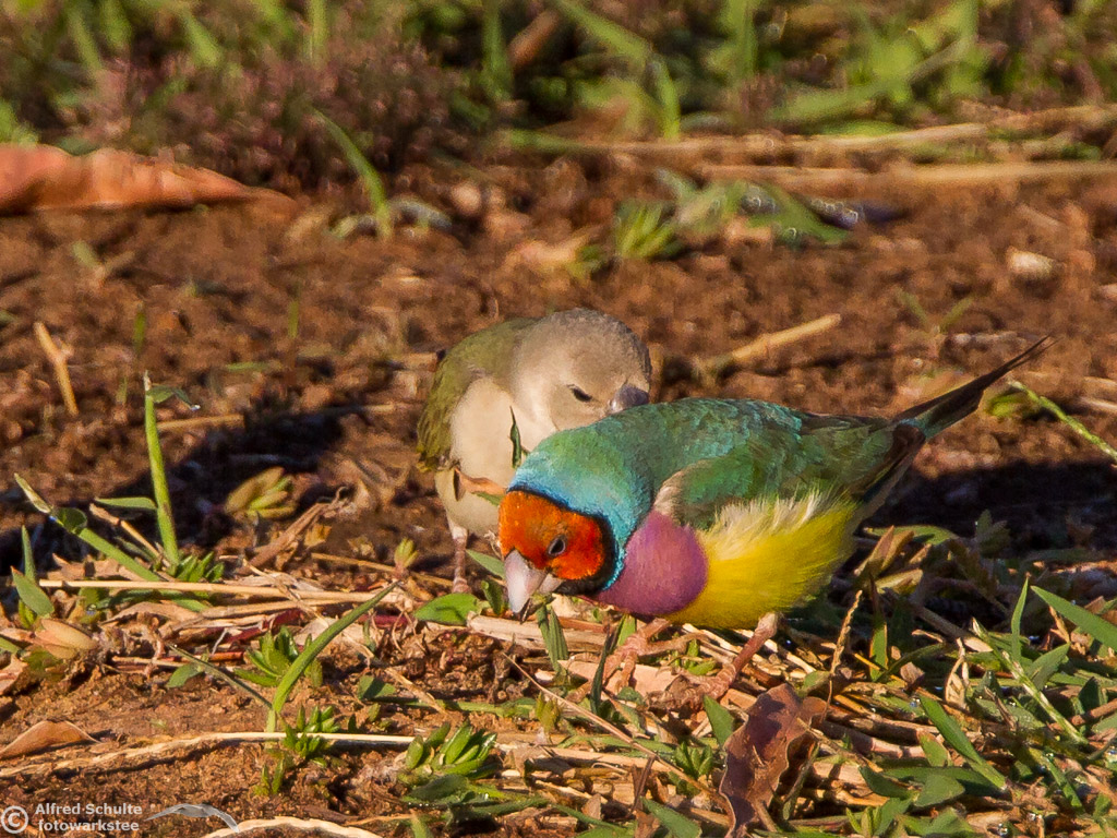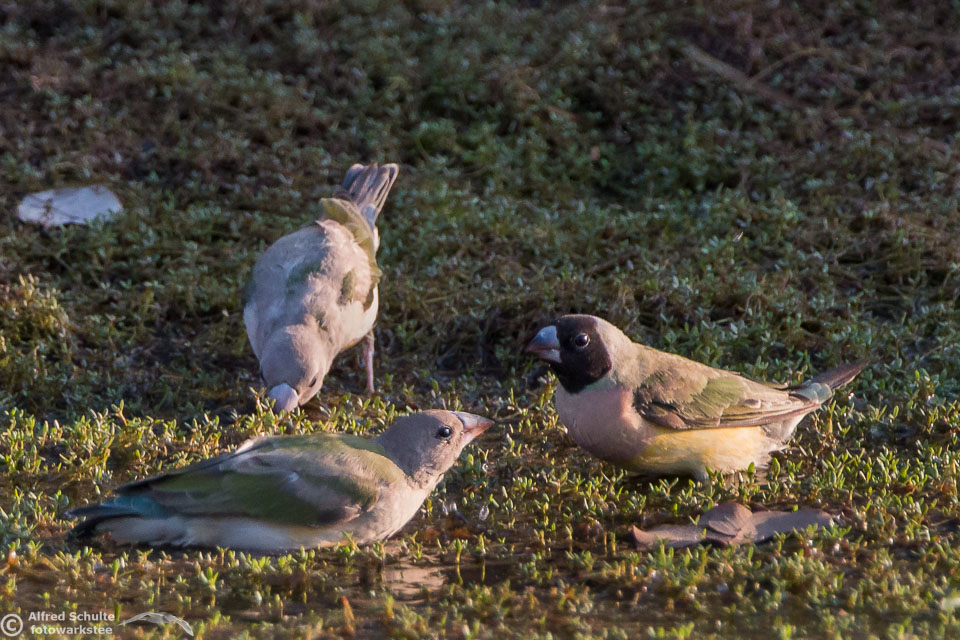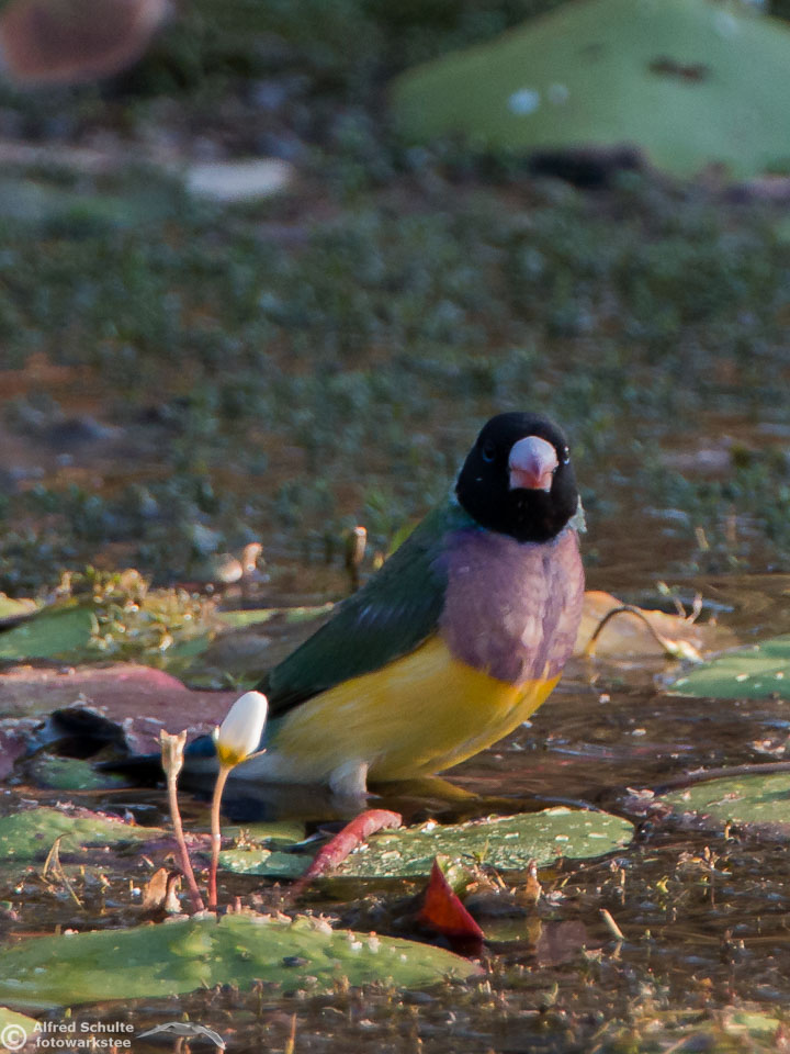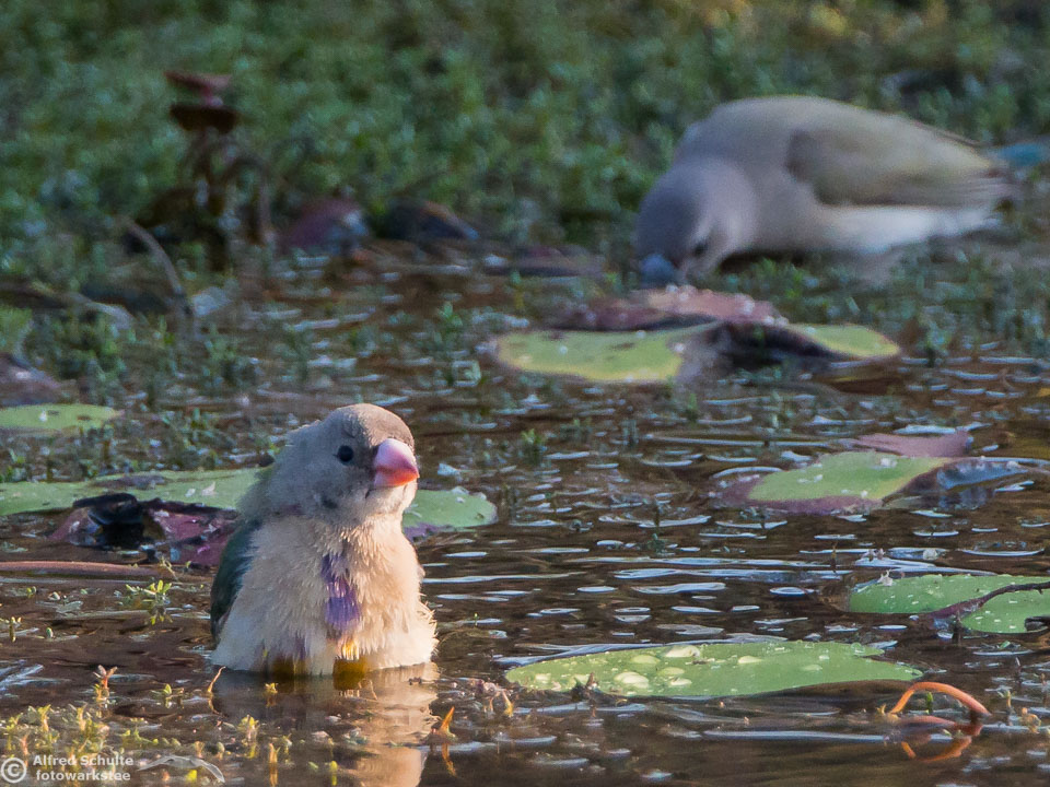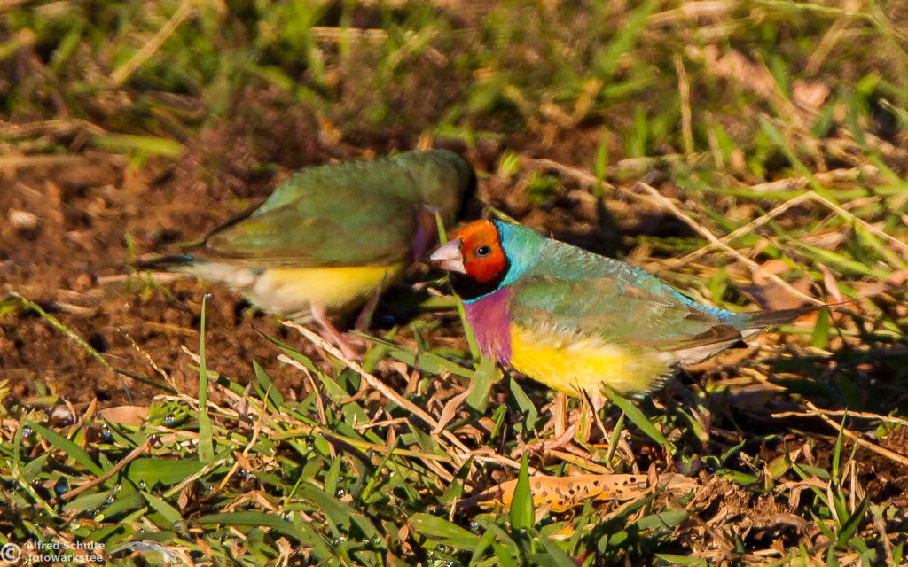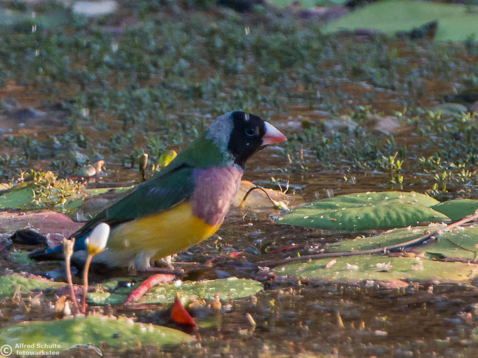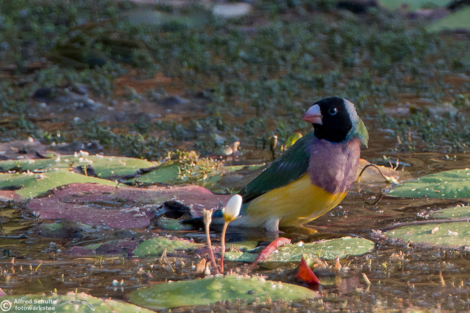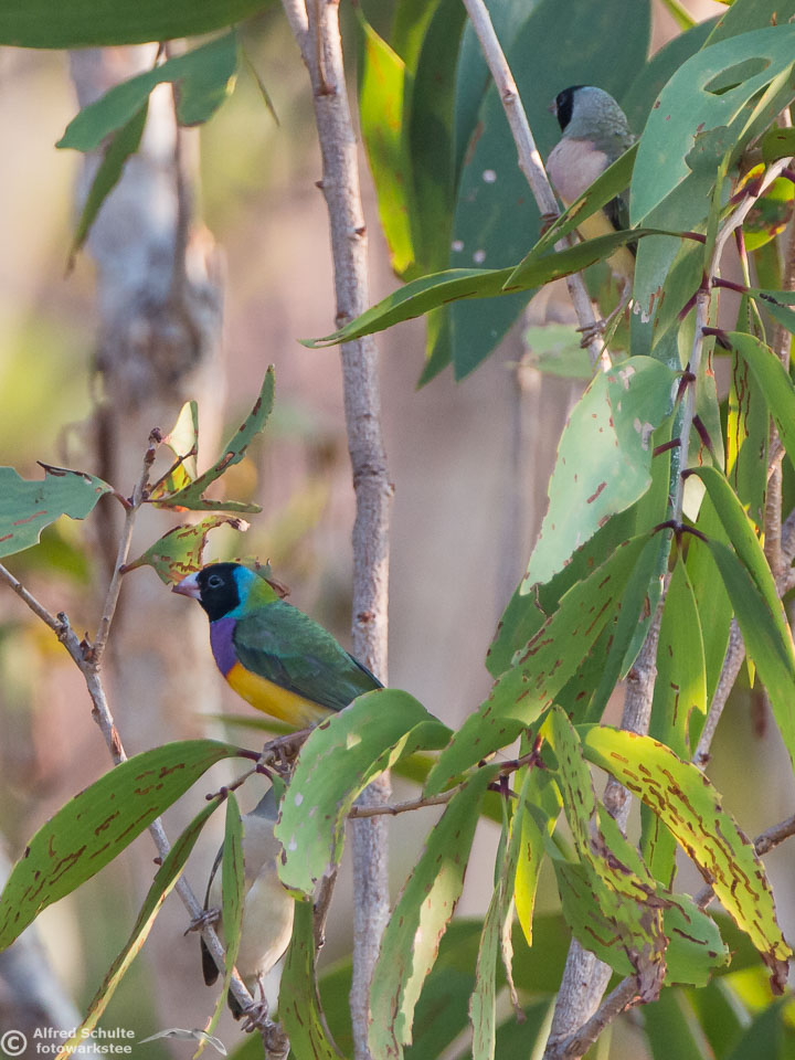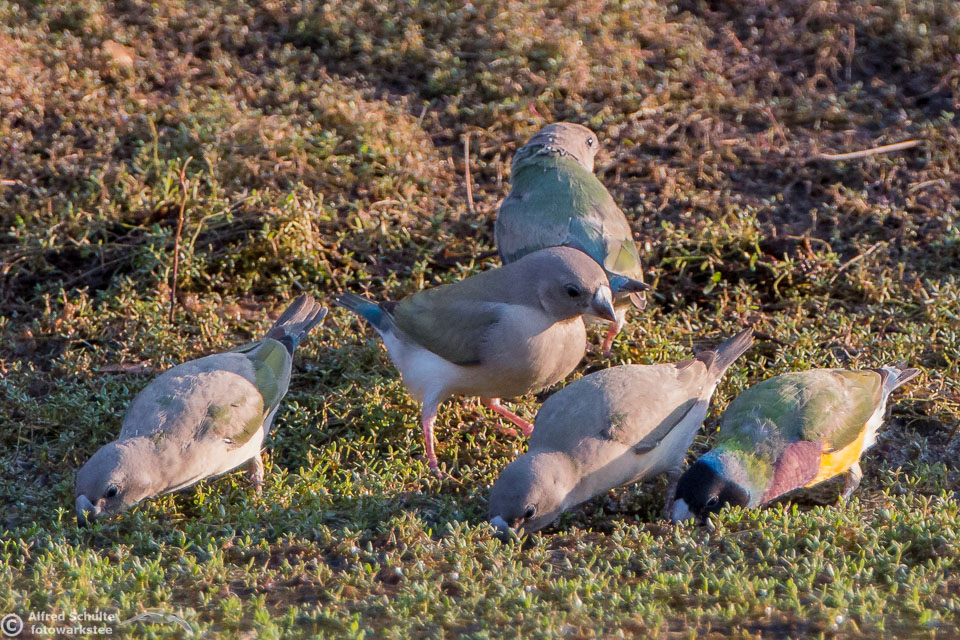 One of my targets during our latest trip to the Northern Territories was to see the colourful Gouldian Finches coming in to a waterhole for their morning drink. Late in the dry season is the best time for this because a lot of waterholes have dried up and it is therefore much easier to find the remaining ones and hope that the Gouldians have had the same idea. Darryl "Biggles" Binns who was with us on this trip organised by the Inala team had located a few possible places, but we needed to search regardless, because some of the waterholes were dry when we finally arrived. But on the last morning in the area around Pine Creek we were in the right spot at the right time and so a dream became true.