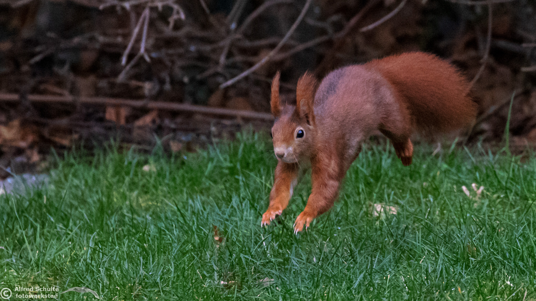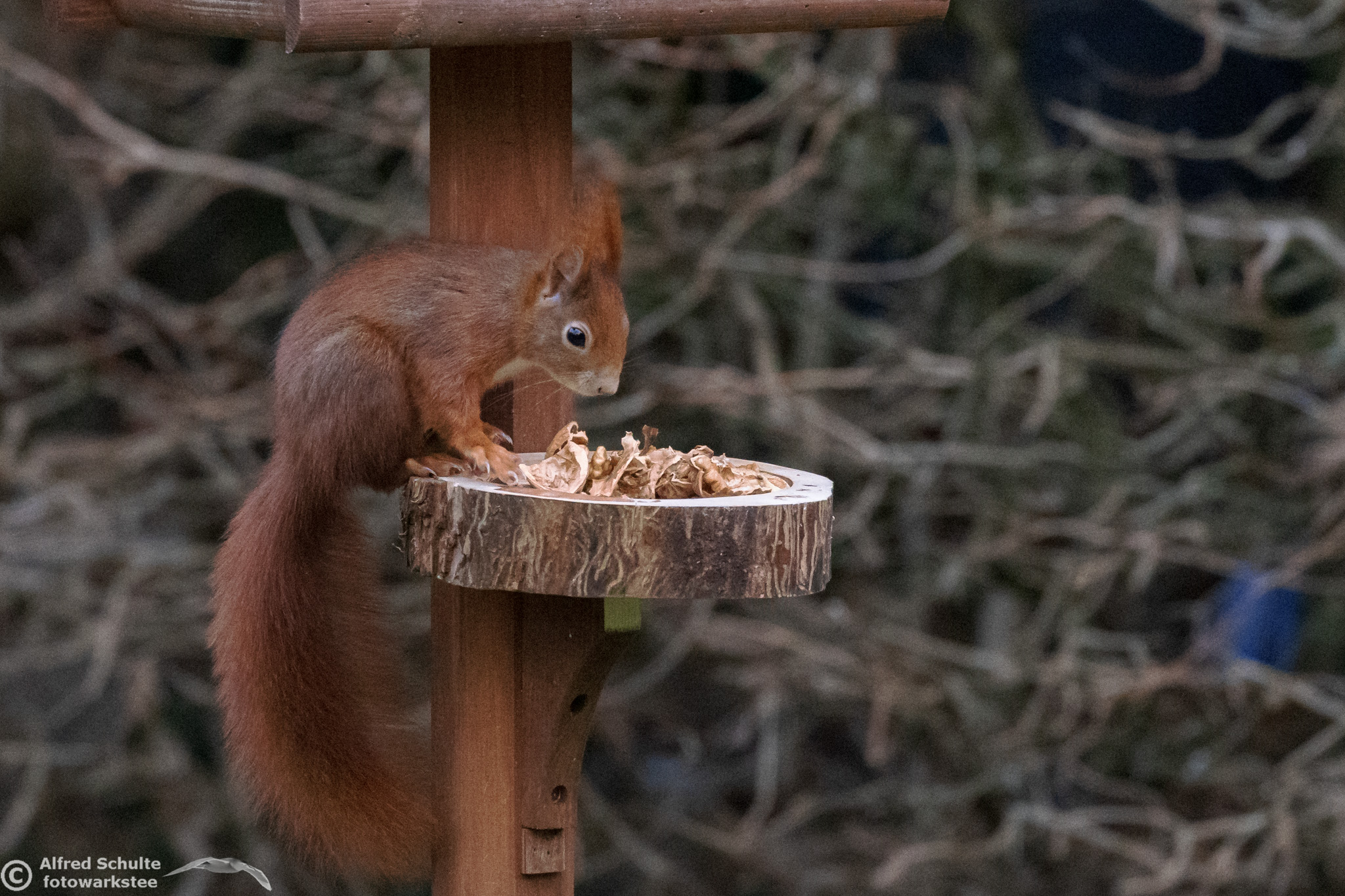 When I noticed that squirrels had started to feed in our bird house, I have put out some nuts for these interesting little guys. They are funny and entertaining but really fast moving, which makes it difficult to get good photographs.