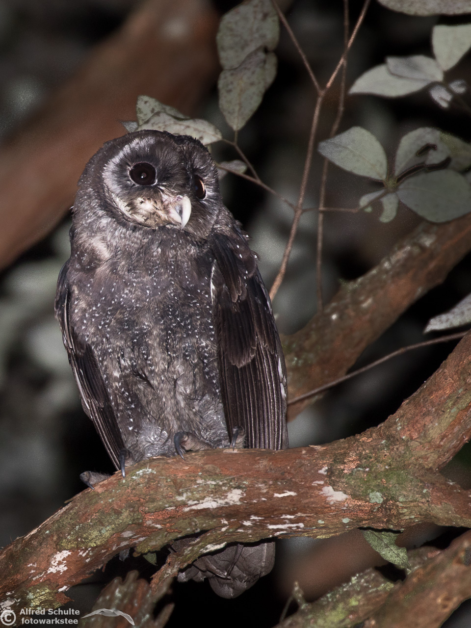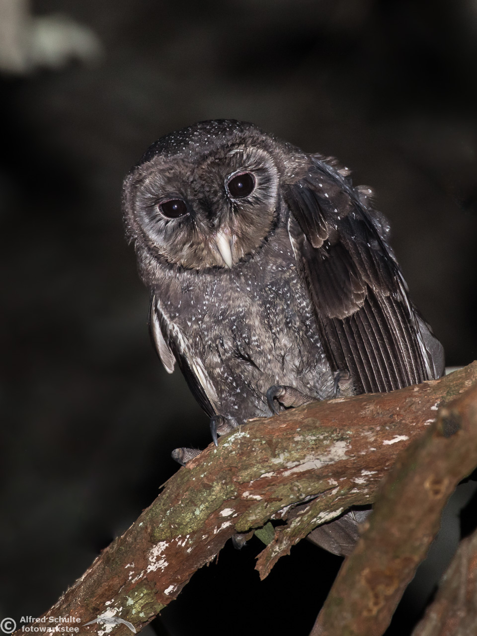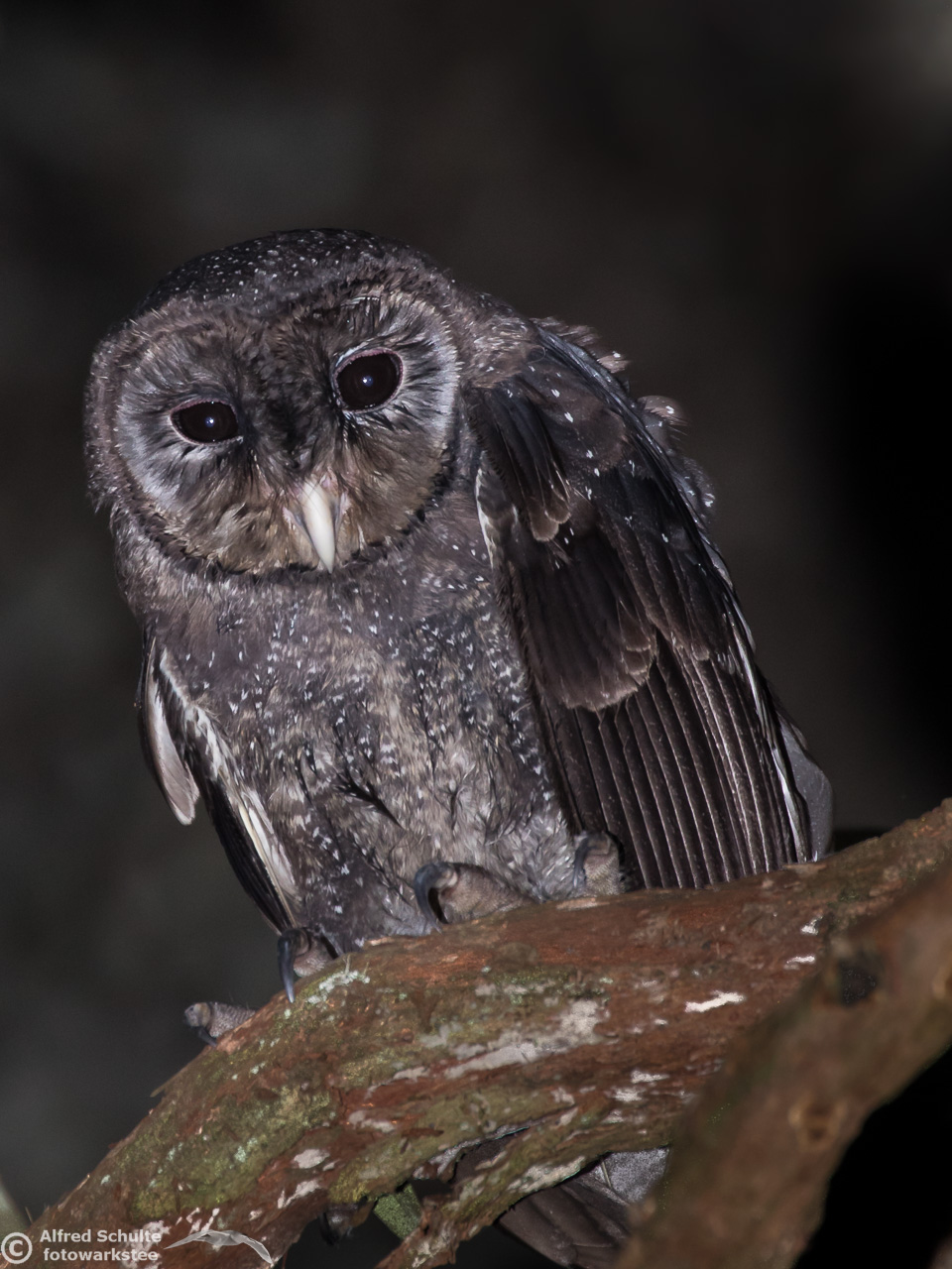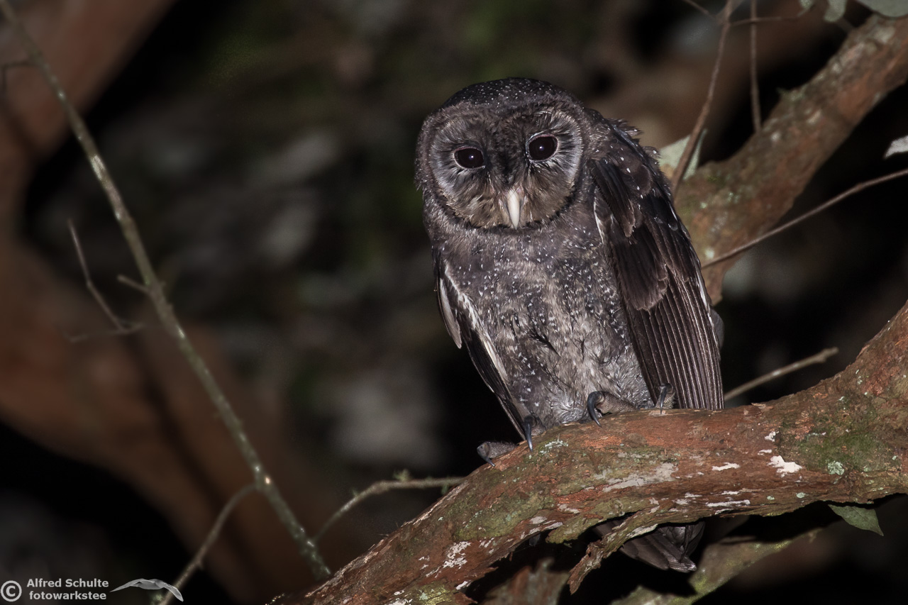 The Greater Sooty Owl (Rußeule for my German friends) is sooty-blackish with fine silvery spots. It has very large black eyes in a round facial disc, which is surrounded by dark edge. The upper-parts of the owl are dark sooty blackish-brown, with fine white spots on the body. The body length varies from 35-45 cm. The female bird is the bigger animal having a wingspan of about 100 cm. Like many other owls, the birds have large feet and strong talons.