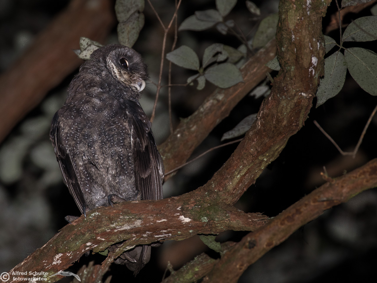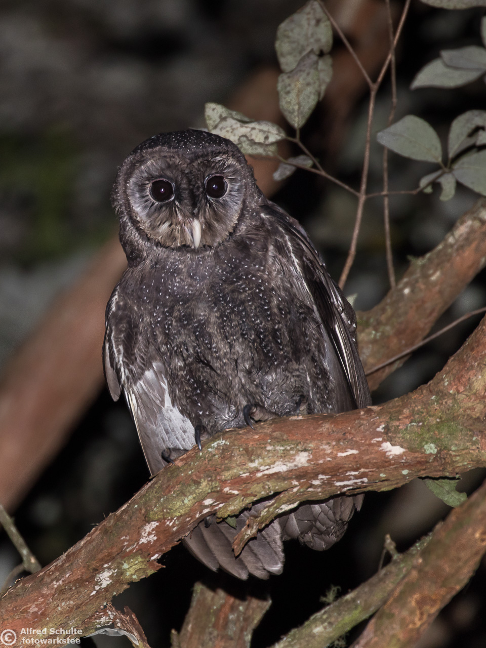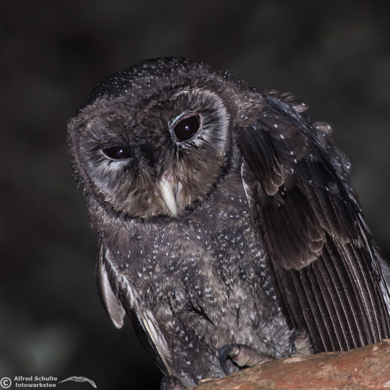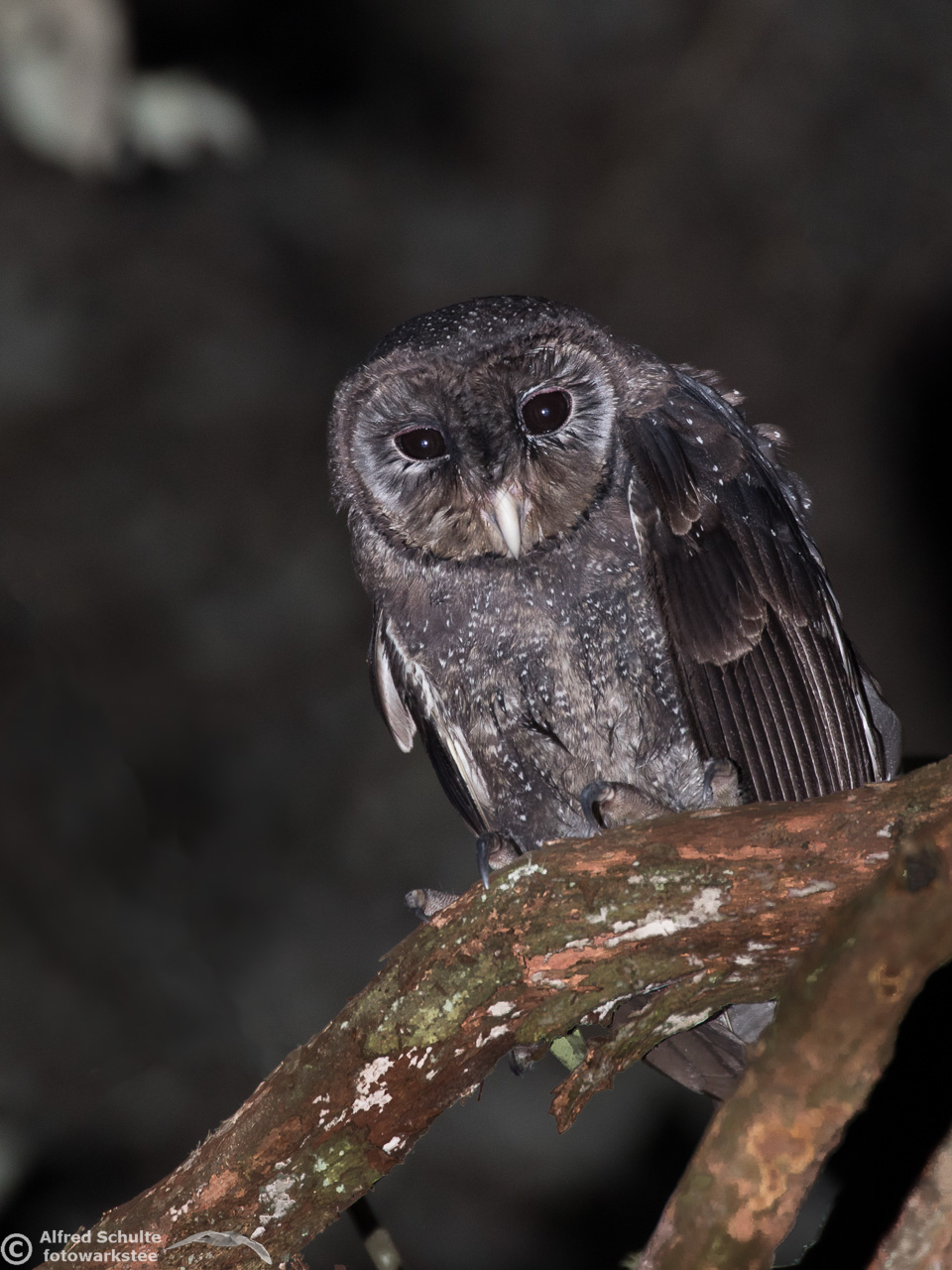 The Greater Sooty Owl (Rußeule for my German friends) is sooty-blackish with fine silvery spots. It has very large black eyes in a round facial disc, which is surrounded by dark edge. The upper-parts of the owl are dark sooty blackish-brown, with fine white spots on the body. The body length varies from 35-45 cm. The female bird is the bigger animal having a wingspan of about 100 cm. Like many other owls, the birds have large feet and strong talons.