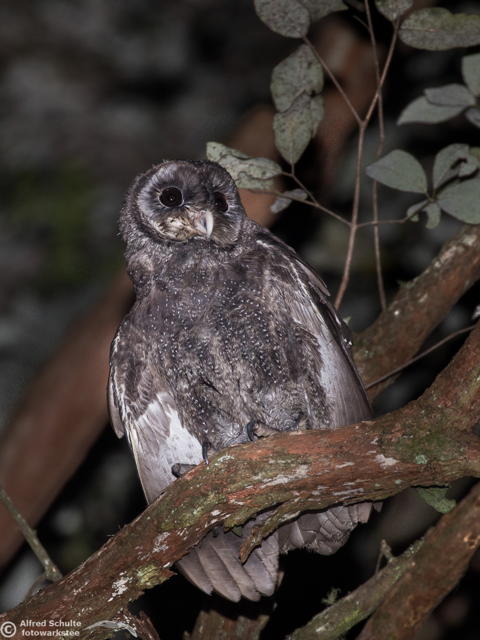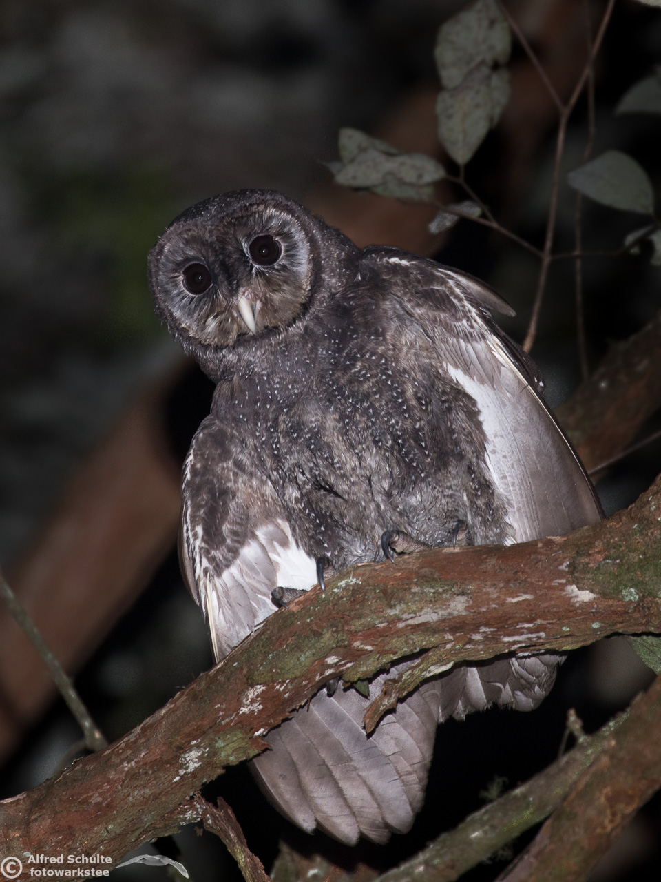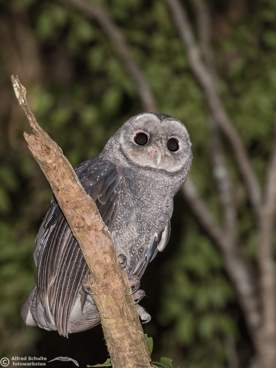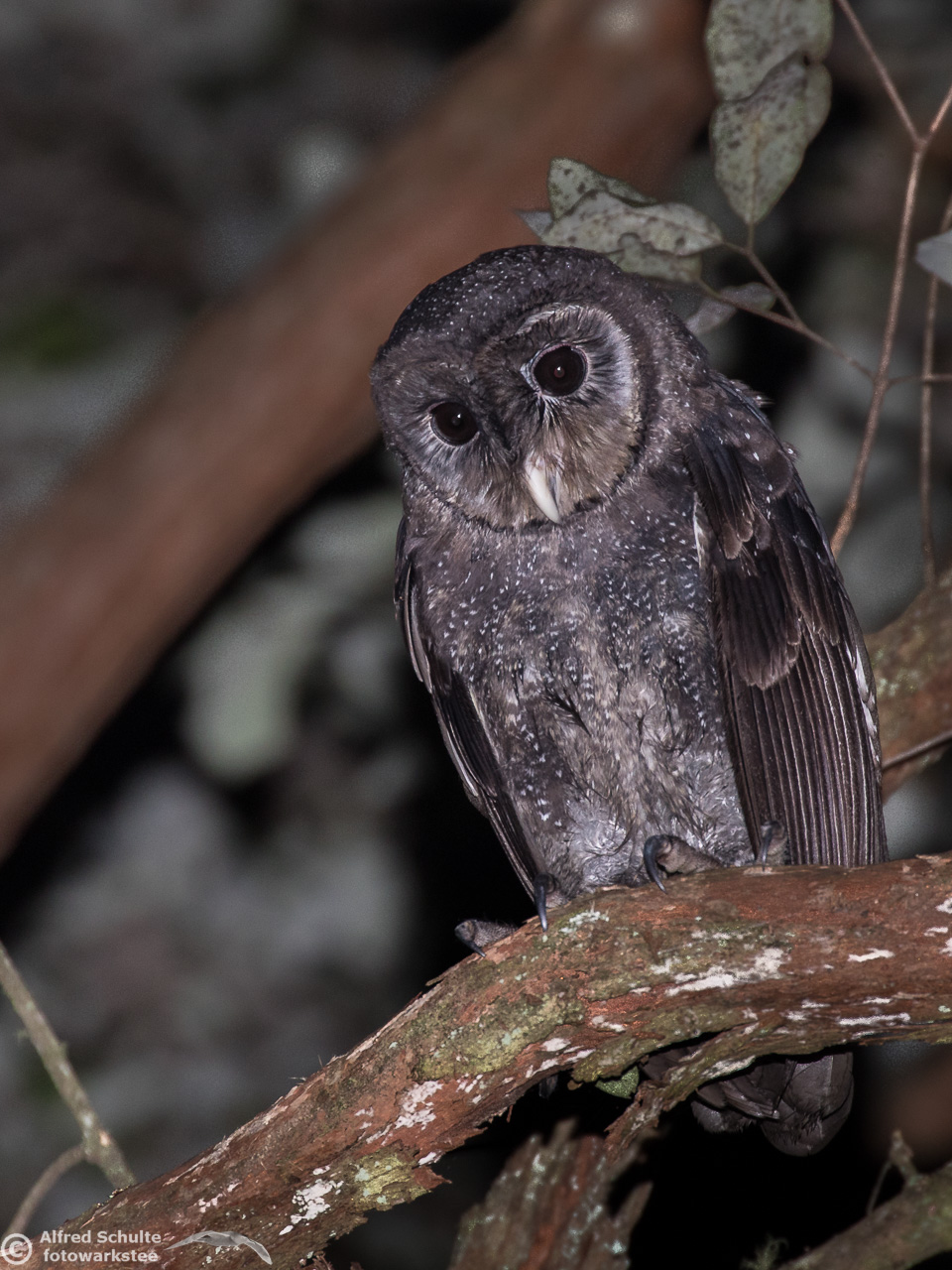 The Greater Sooty Owl (Rußeule for my German friends) is sooty-blackish with fine silvery spots. It has very large black eyes in a round facial disc, which is surrounded by dark edge. The upper-parts of the owl are dark sooty blackish-brown, with fine white spots on the body. The body length varies from 35-45 cm. The female bird is the bigger animal having a wingspan of about 100 cm. Like many other owls, the birds have large feet and strong talons.