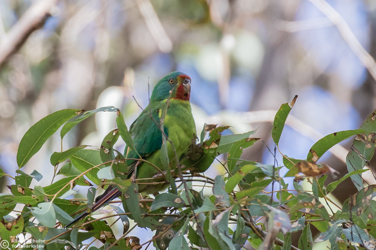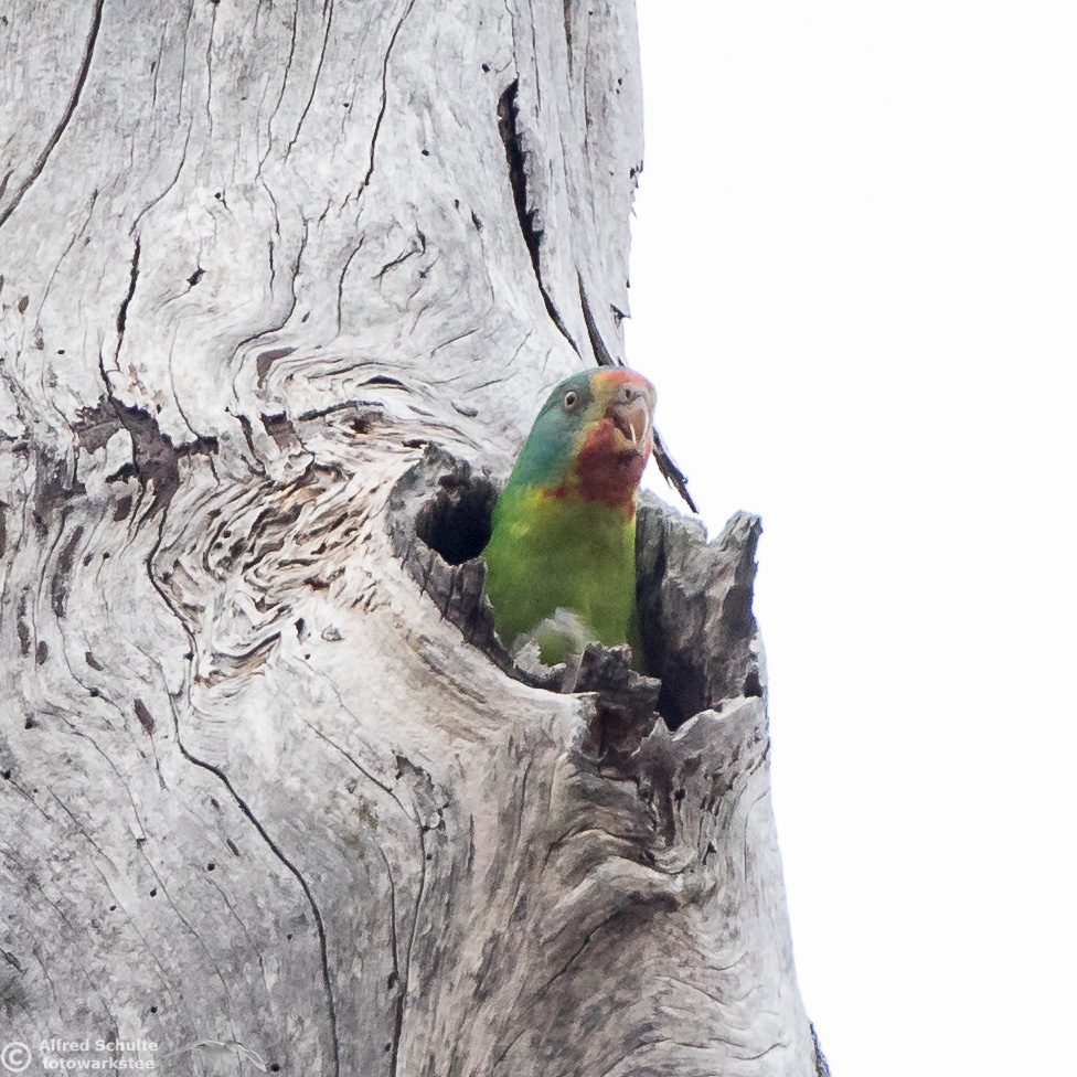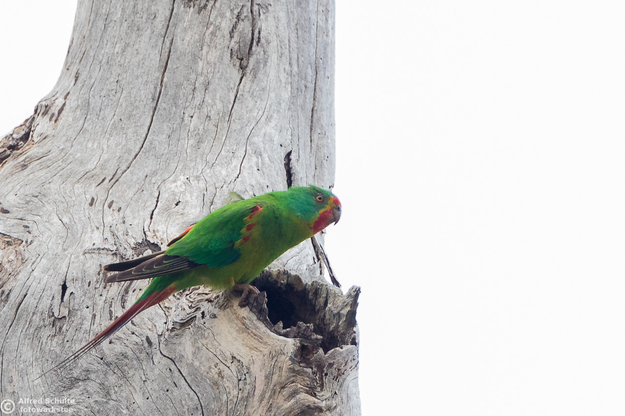 Our daughter Christine and I went to Bruny Island in November 2016 to see and photograph these birds. The Swift Parrots do not breed every year in the same spots in Tasmania, their breeding ground are determined by their main food source: flowering Blue Gums. And in 2016 there was a massive flowering happening on Bruny Island, and so the vast majority of the Swift Parrot population was on Bruny. We were lucky to arrive there, before the birds fledged and left the nest.
