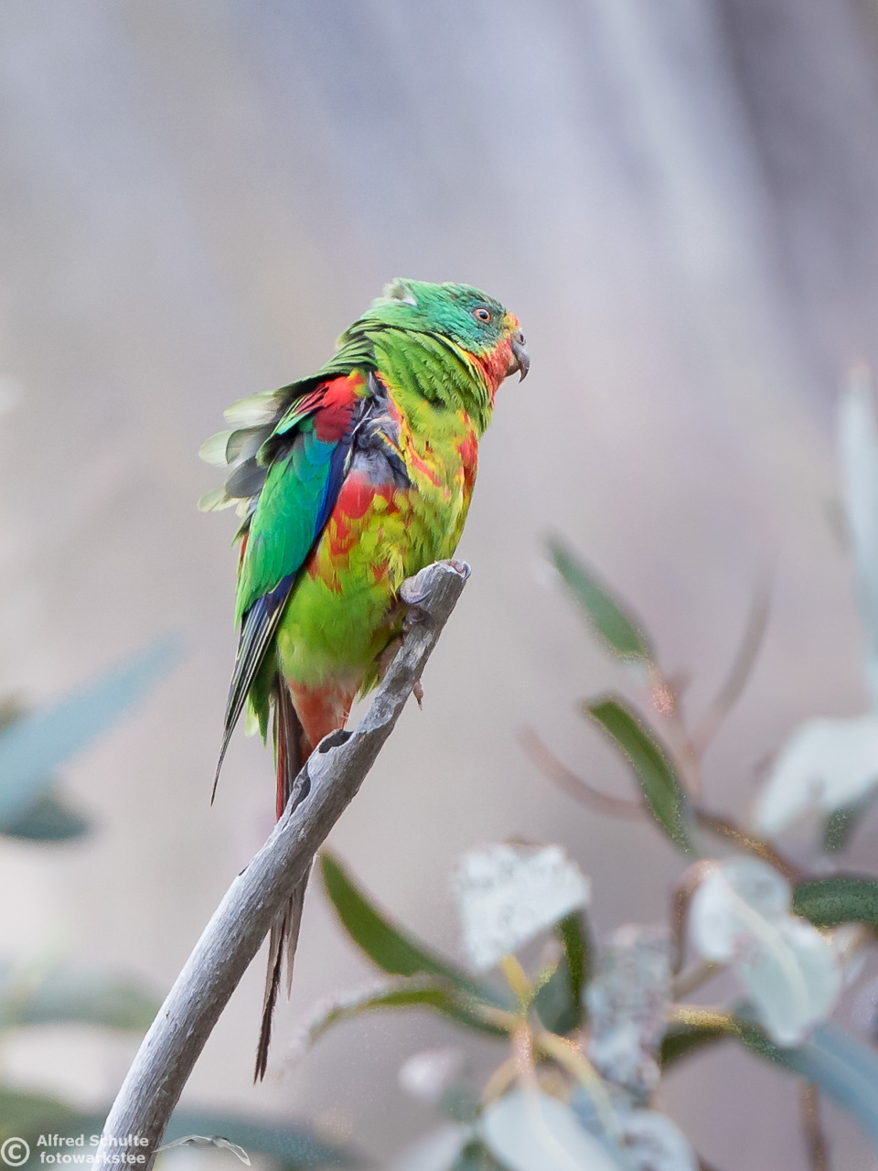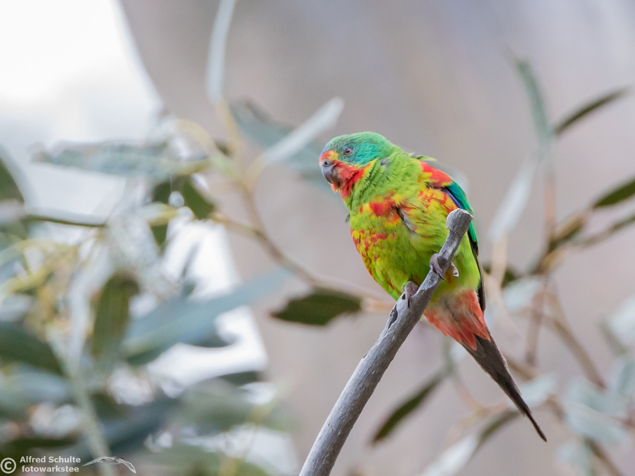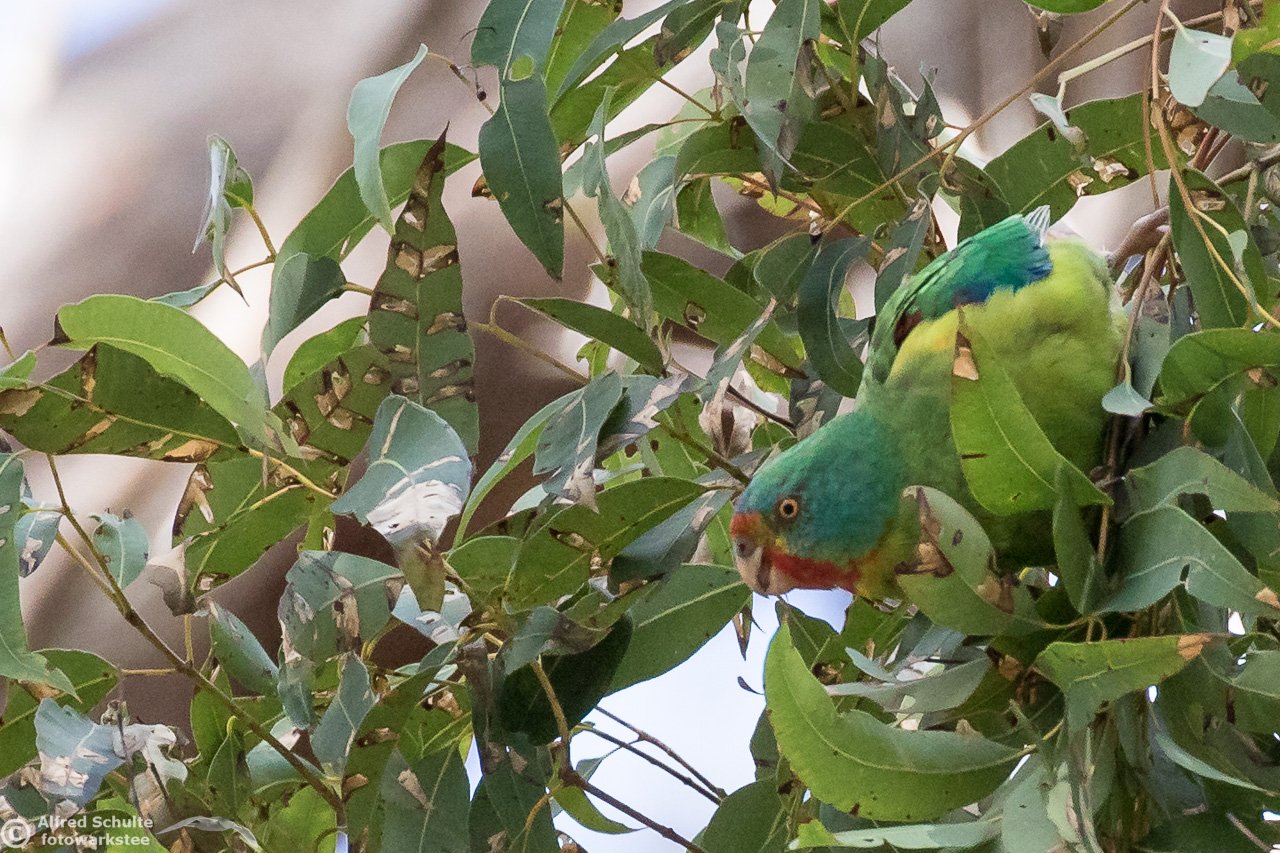 Our daughter Christine and I went to Bruny Island in November 2016 to see and photograph these birds. The Swift Parrots do not breed every year in the same spots in Tasmania, their breeding ground are determined by their main food source: flowering Blue Gums. And in 2016 there was a massive flowering happening on Bruny Island, and so the vast majority of the Swift Parrot population was on Bruny. We were lucky to arrive there, before the birds fledged and left the nest.