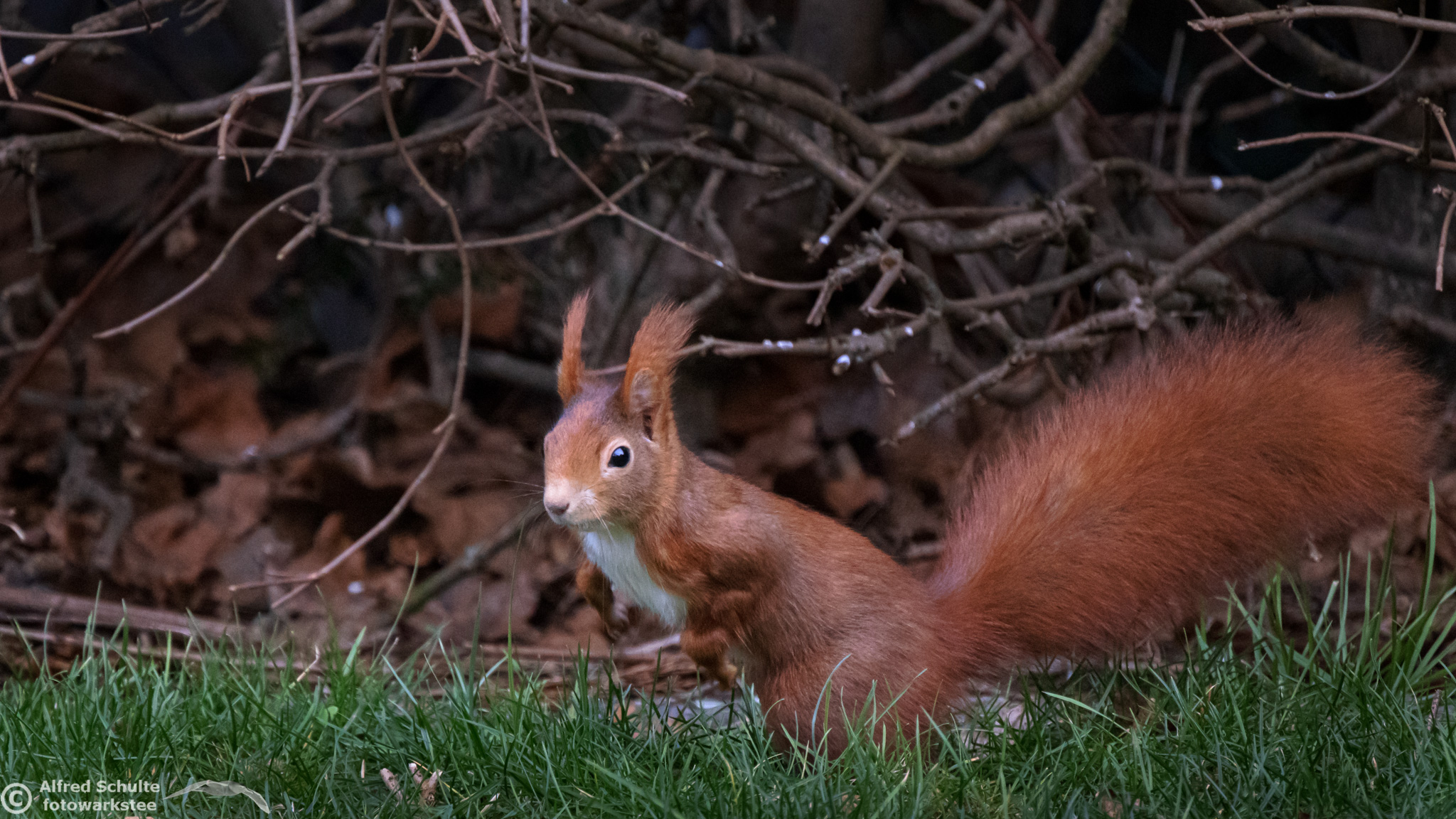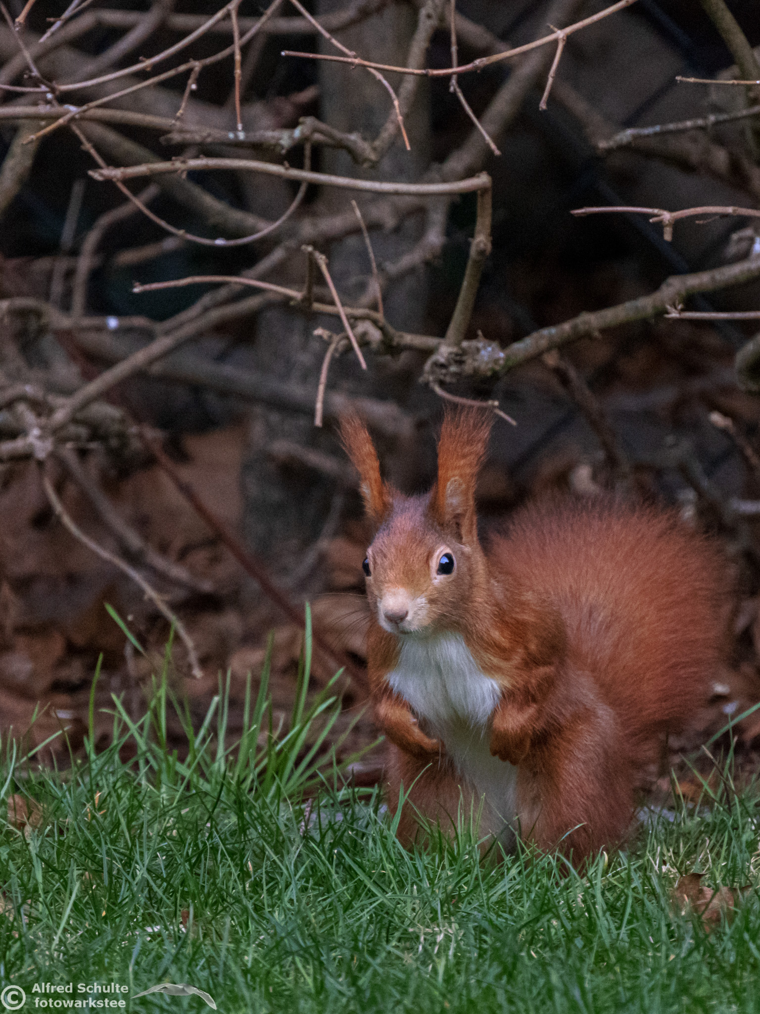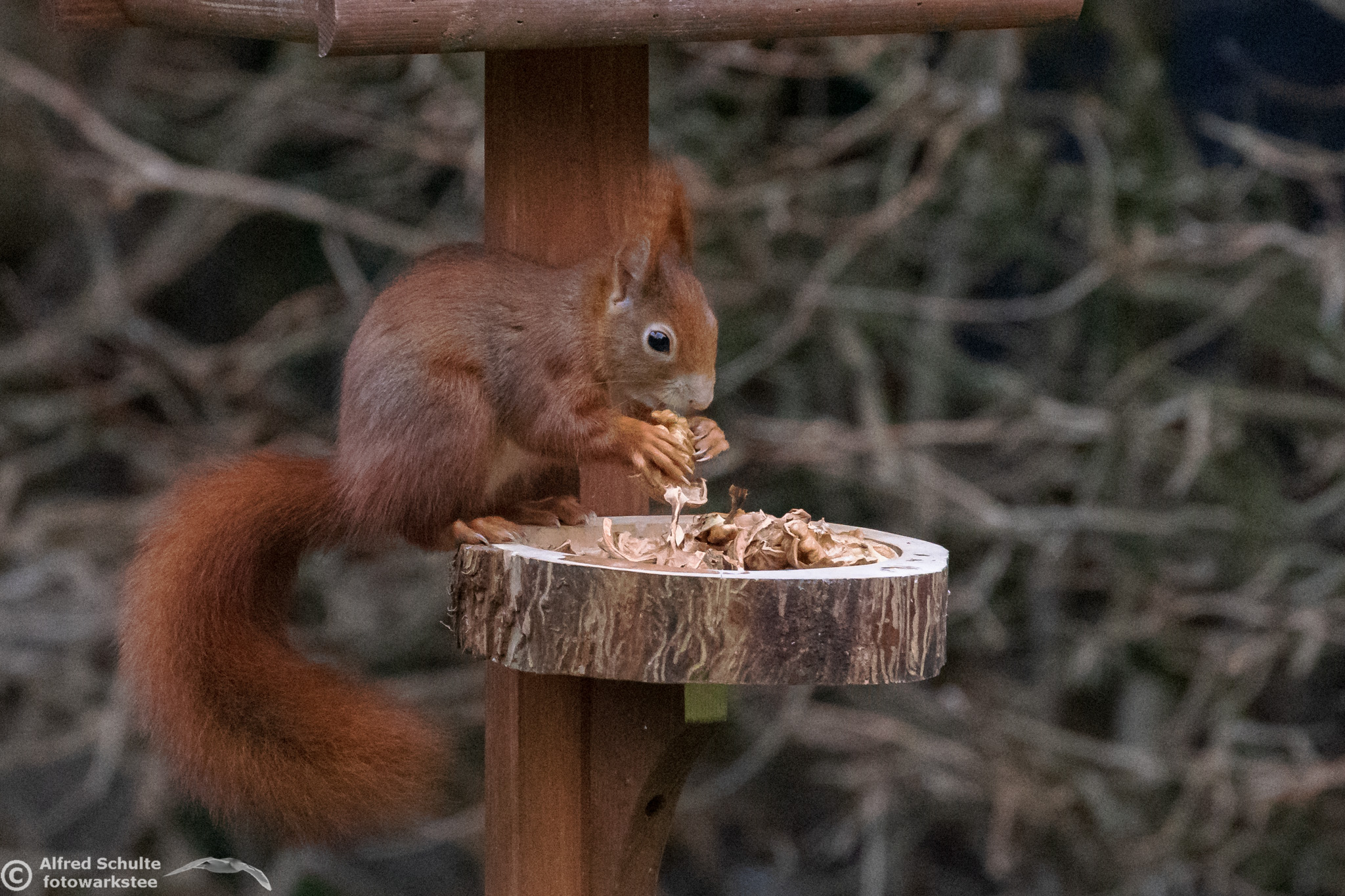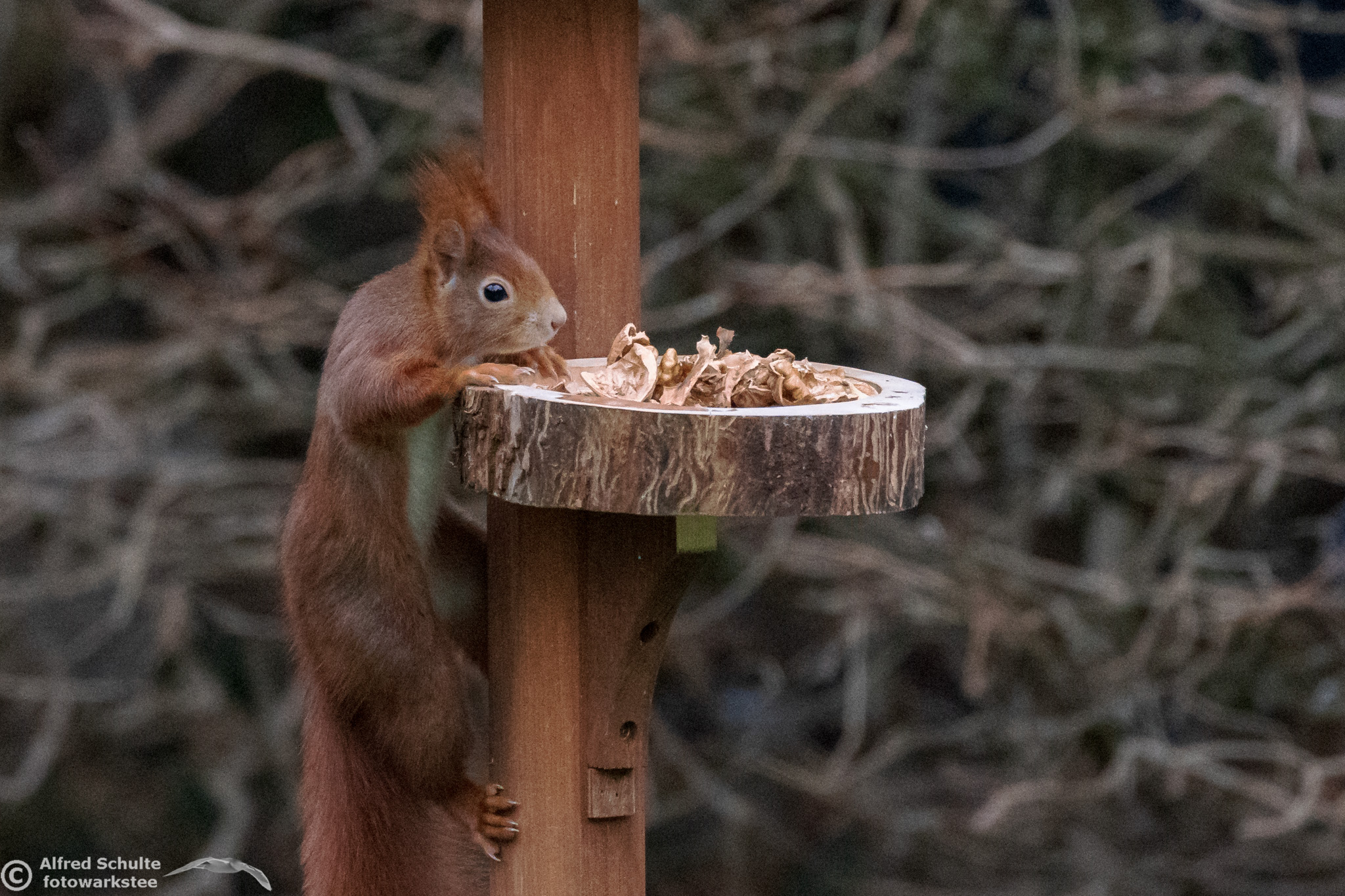When I noticed that squirrels had started to feed in our bird house, I have put out some nuts for these interesting little guys. They are funny and entertaining but really fast moving, which makes it difficult to get good photographs.